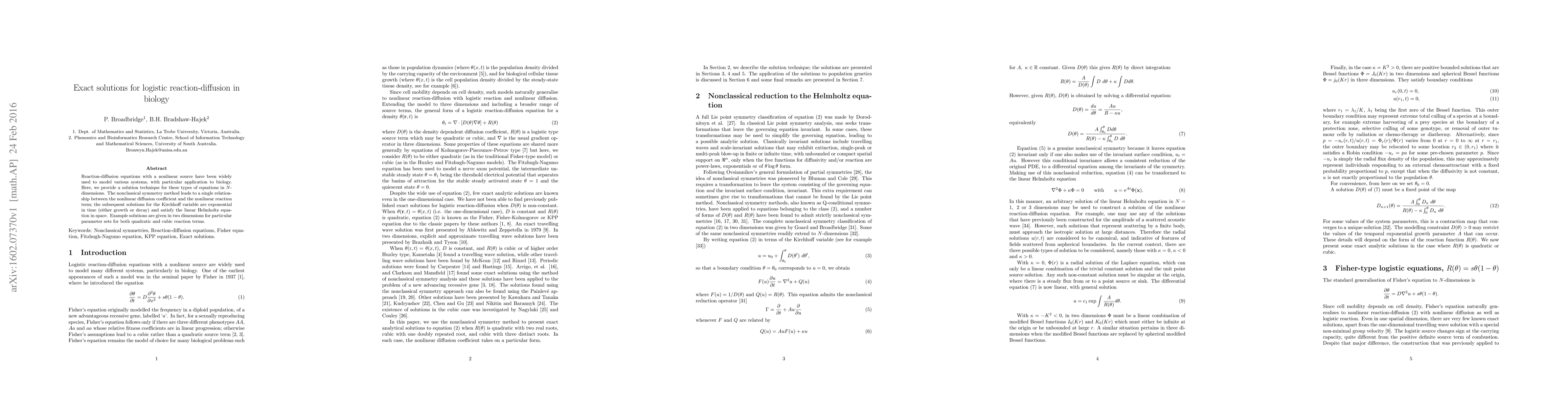 Reaction-diffusion equations with a nonlinear source have been widely used to model various systems, with particular application to biology. Here, we provide a solution technique for these types of equations in $N$-dimensions. The nonclassical symmetry method leads to a single relationship between the nonlinear diffusion coefficient and the nonlinear reaction term; the subsequent solutions for the Kirchhoff variable are exponential in time (either growth or decay) and satisfy the linear Helmholtz equation in space. Example solutions are given in two dimensions for particular parameter sets for both quadratic and cubic reaction terms.