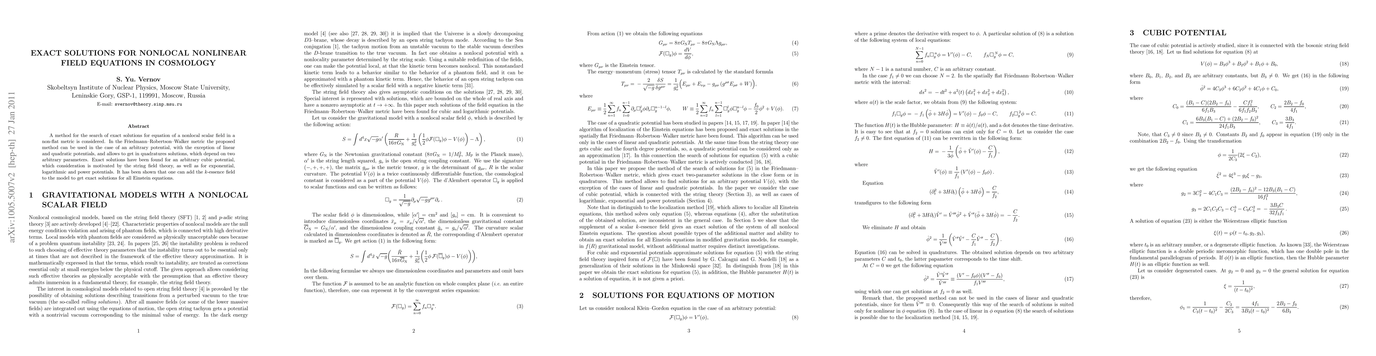 A method for the search of exact solutions for equation of a nonlocal scalar field in a non-flat metric is considered. In the Friedmann-Robertson-Walker metric the proposed method can be used in the case of an arbitrary potential, with the exception of linear and quadratic potentials, and allows to get in quadratures solutions, which depend on two arbitrary parameters. Exact solutions have been found for an arbitrary cubic potential, which consideration is motivated by the string field theory, as well as for exponential, logarithmic and power potentials. It has been shown that one can add the k-essence field to the model to get exact solutions for all Einstein equations.