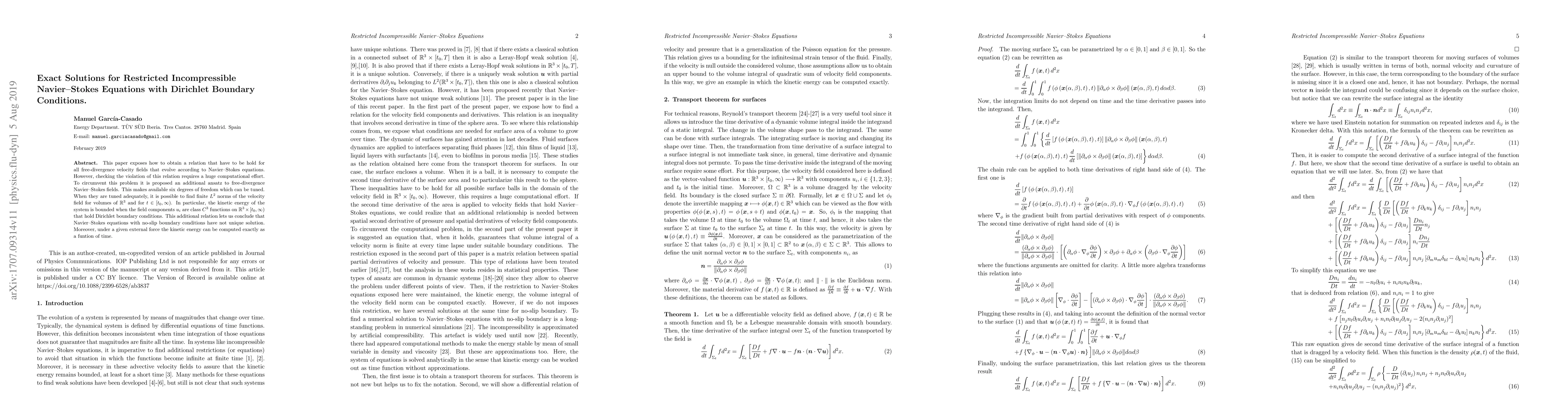 This paper exposes how to obtain a relation that have to be hold for all free--divergence velocity fields that evolve according to Navier--Stokes equations. However, checking the violation of this relation requires a huge computational effort. To circumvent this problem it is proposed an additional antsatz to free-divergent Navier--Stokes fields. This makes available six degrees of freedom which can be tuned. When they are tuned adequately, it is possible to find finite $L^2$ norms of the velocity field for volumes of $\mathbb{R}^3$ and for $t\in[t_0,\infty)$. In particular, the kinetic energy of the system is bounded when the field components $u_i$ are class $C^3$ functions on $\mathbb{R}^3\times[t_0,\infty)$ that hold Dirichlet boundary conditions. This additional relation lets us conclude that Navier--Stokes equations with no-slip boundary conditions have not unique solution. Moreover, under a given external force the kinetic energy can be computed exactly as a funtion of time.