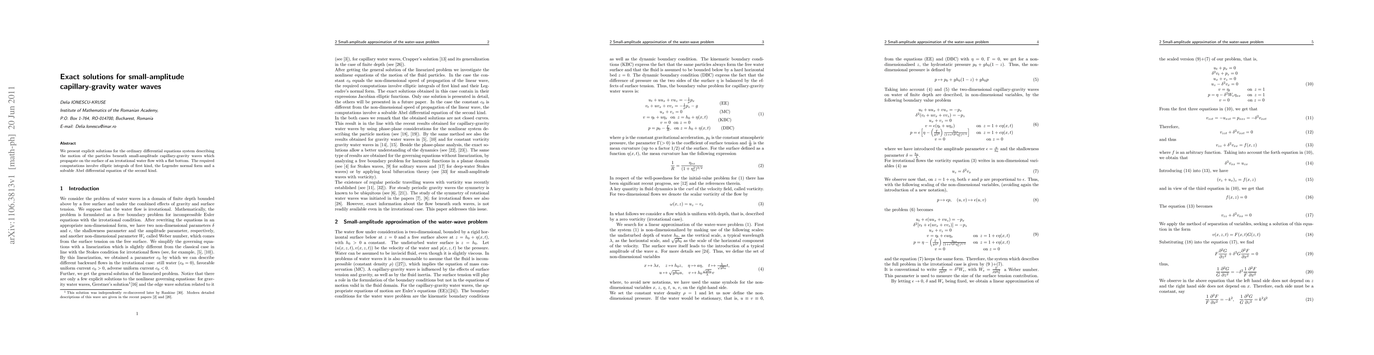 This paper provides exact solutions for the differential equations governing small-amplitude capillary-gravity water waves, utilizing elliptic integrals, the Legendre normal form, and a solvable Abel differential equation to describe particle motion under the wave surface.