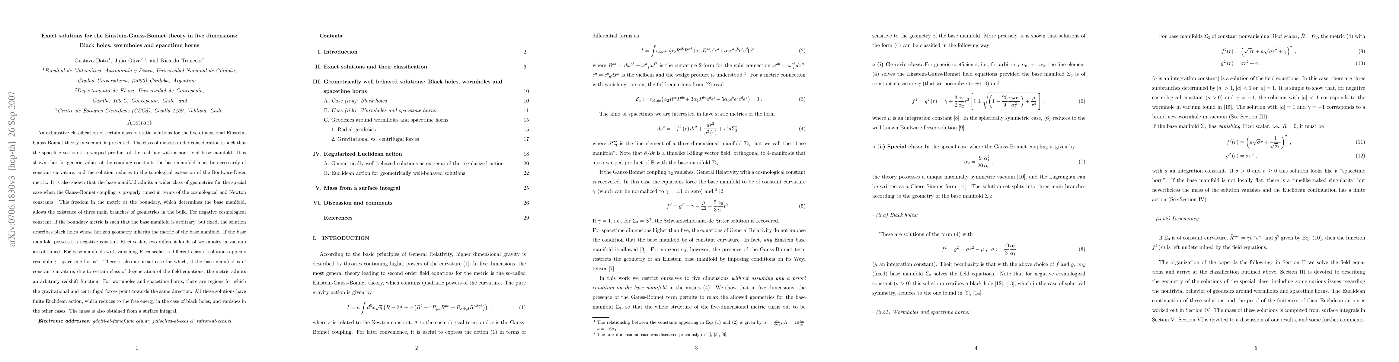 An exhaustive classification of certain class of static solutions for the five-dimensional Einstein-Gauss-Bonnet theory in vacuum is presented. The class of metrics under consideration is such that the spacelike section is a warped product of the real line with a nontrivial base manifold. It is shown that for generic values of the coupling constants the base manifold must be necessarily of constant curvature, and the solution reduces to the topological extension of the Boulware-Deser metric. It is also shown that the base manifold admits a wider class of geometries for the special case when the Gauss-Bonnet coupling is properly tuned in terms of the cosmological and Newton constants. This freedom in the metric at the boundary, which determines the base manifold, allows the existence of three main branches of geometries in the bulk. For negative cosmological constant, if the boundary metric is such that the base manifold is arbitrary, but fixed, the solution describes black holes whose horizon geometry inherits the metric of the base manifold. If the base manifold possesses a negative constant Ricci scalar, two different kinds of wormholes in vacuum are obtained. For base manifolds with vanishing Ricci scalar, a different class of solutions appears resembling "spacetime horns". There is also a special case for which, if the base manifold is of constant curvature, due to certain class of degeneration of the field equations, the metric admits an arbitrary redshift function. For wormholes and spacetime horns, there are regions for which the gravitational and centrifugal forces point towards the same direction. All these solutions have finite Euclidean action, which reduces to the free energy in the case of black holes, and vanishes in the other cases. Their mass is also obtained from a surface integral.