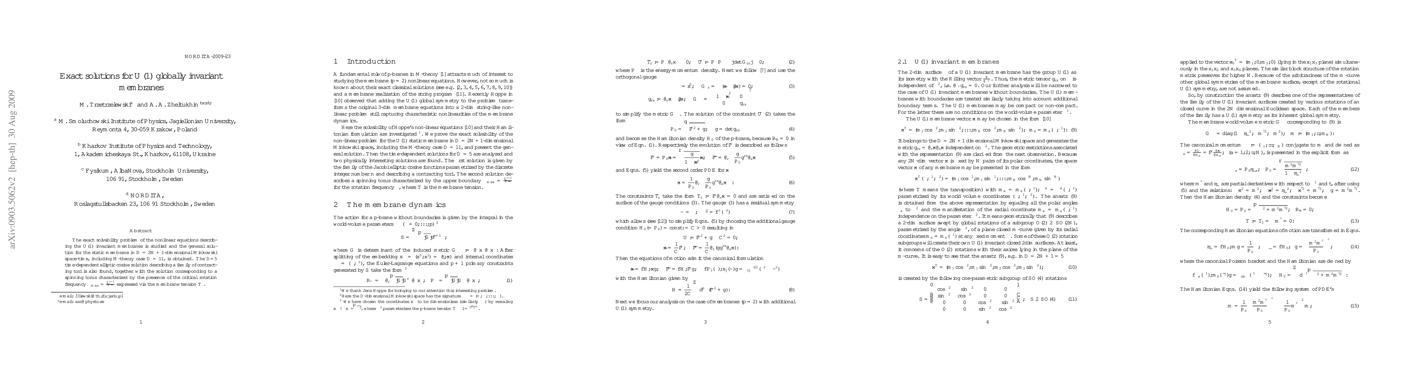 Researchers have solved a complex problem in physics to find exact solutions for U(1) invariant membranes, including static and time-dependent cases, with implications for understanding spinning tori and membrane properties.