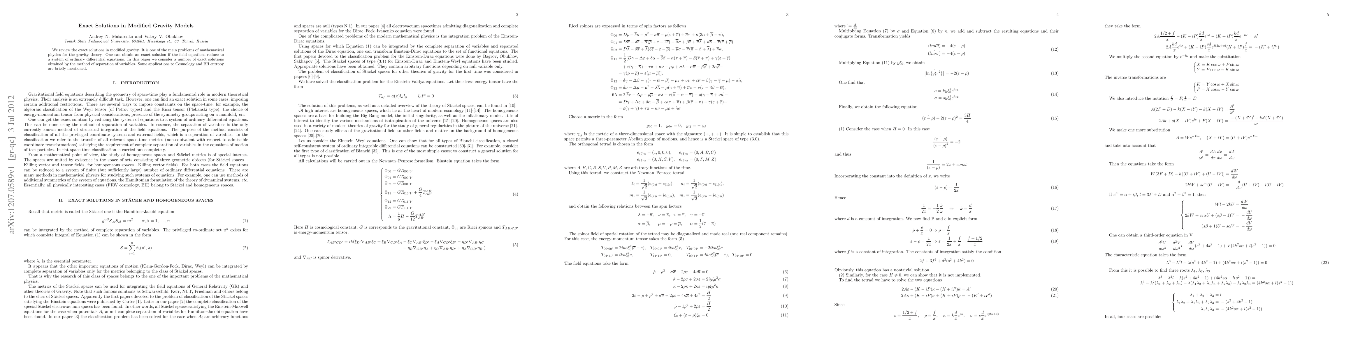 This paper reviews exact solutions in modified gravity models, focusing on those derived through the method of separation of variables, which reduce the field equations to ordinary differential equations. Brief applications to cosmology and black hole entropy are also discussed.