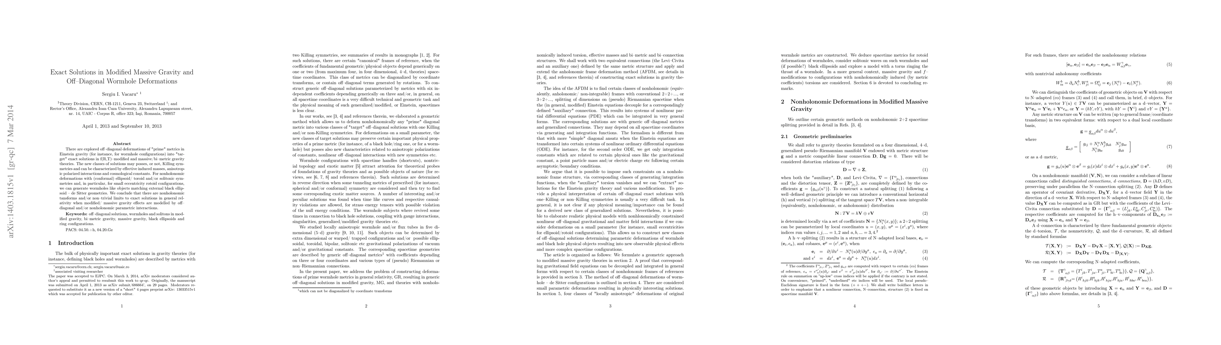 There are explored off-diagonal deformations of "prime" metrics in Einstein gravity (for instance, for wormhole configurations) into "target" exact solutions in f(R,T)-modified and massive/ bi-metric gravity theories. The new classes of solutions may posses, or not, Killing symmetries and can be characterized by effective induced masses, anisotropic polarized interactions and cosmological constants. For nonholonomic deformations with (conformal) ellipsoid/ toroid and/or solitonic symmetries and, in particular, for small eccentricity rotoid configurations, we can generate wormholes like objects matching external black ellipsoid - de Sitter geometries. We conclude that there are nonholonomic transforms and/or non-trivial limits to exact solutions in general relativity when modified/ massive gravity effects are modeled by off-diagonal and/or nonholonomic parametric interactions.