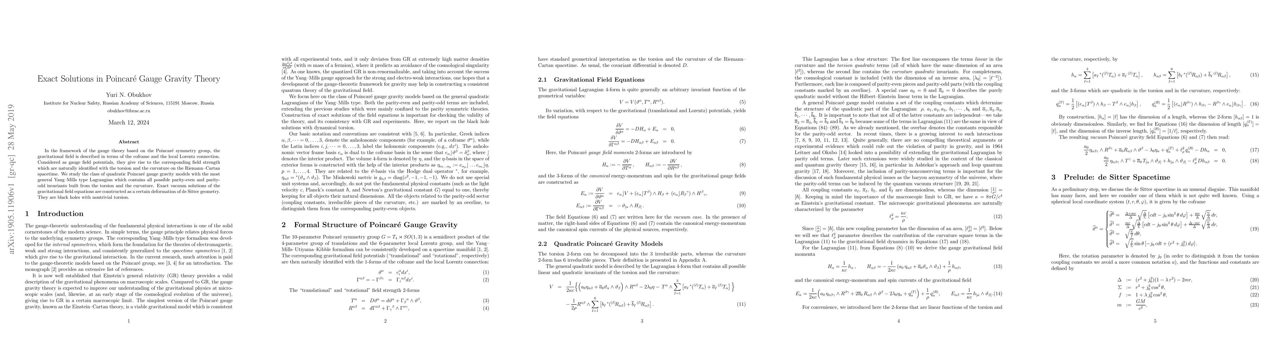This paper explores quadratic Poincar\'e gauge gravity models using the most general Yang-Mills Lagrangian. Exact vacuum solutions are constructed as deformed de Sitter geometries, revealing black holes with nontrivial torsion.