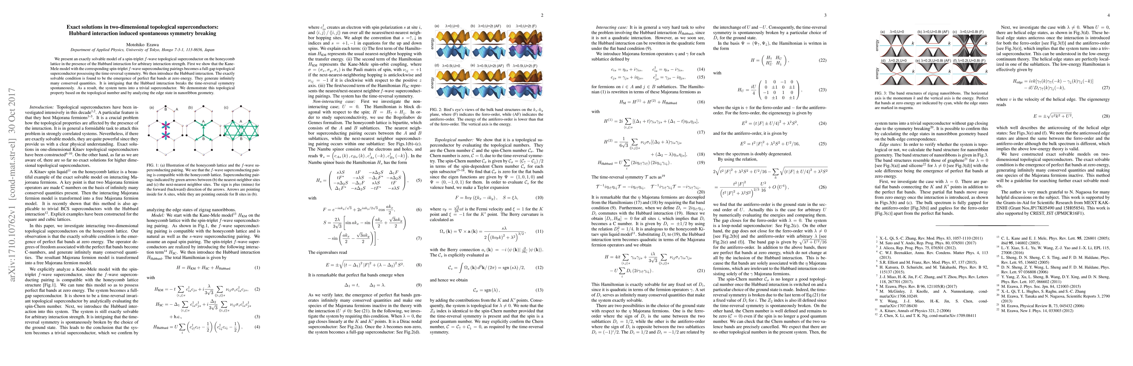 We present an exactly solvable model of a spin-triplet $f$-wave topological superconductor on the honeycomb lattice in the presence of the Hubbard interaction for arbitrary interaction strength. First we show that the Kane-Mele model with the corresponding spin-triplet $f$-wave superconducting pairings becomes a full-gap topological superconductor possessing the time-reversal symmetry. We then introduce the Hubbard interaction. The exactly solvable condition is found to be the emergence of perfect flat bands at zero energy. They generate infinitely many conserved quantities. It is intriguing that the Hubbard interaction breaks the time-reversal symmetry spontaneously. As a result, the system turns into a trivial superconductor. We demonstrate this topological property based on the topological number and by analyzing the edge state in nanoribbon geometry.