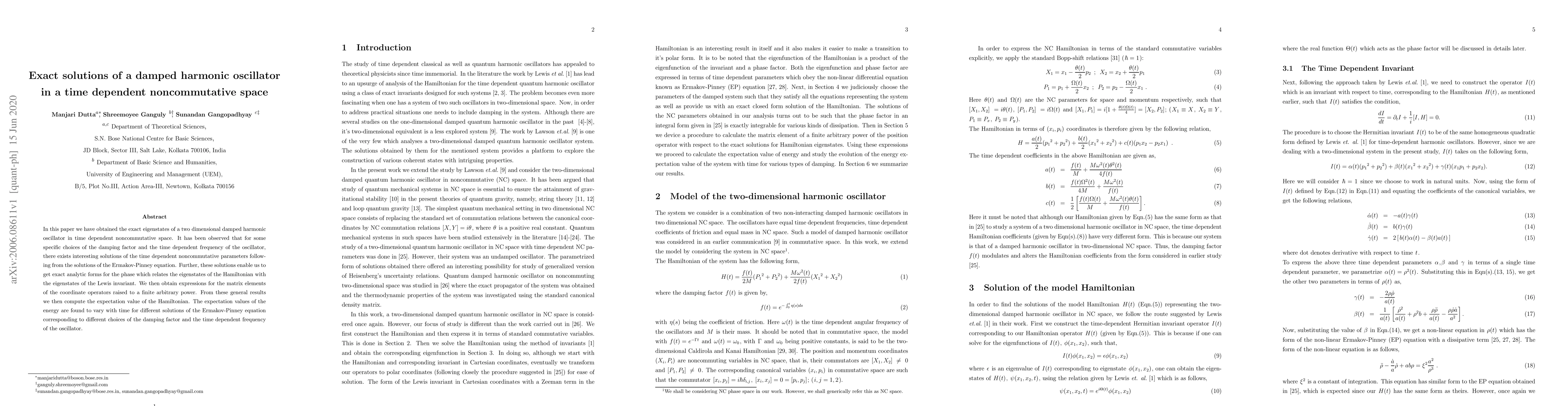 This paper presents exact solutions for a two-dimensional damped harmonic oscillator in time-dependent noncommutative space, revealing solutions derived from the Ermakov-Pinney equation that provide exact analytic forms for the phase relating Hamiltonian and Lewis invariant eigenstates. The study computes matrix elements and finds time-varying energy expectations influenced by the damping factor and frequency variations.