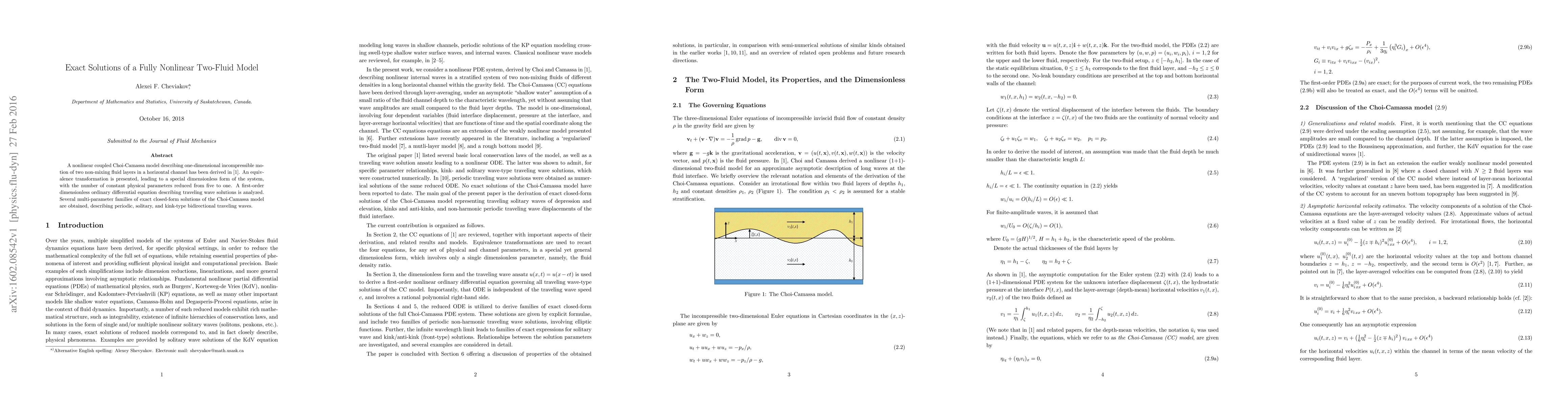 A nonlinear coupled Choi-Camassa model describing one-dimensional incompressible motion of two non-mixing fluid layers in a horizontal channel has been derived in Ref.1. An equivalence transformation is presented, leading to a special dimensionless form of the system, with the number of constant physical parameters reduced from five to one. A first-order dimensionless ordinary differential equation describing traveling wave solutions is analyzed. Several multi-parameter families of exact closed-form solutions of the Choi-Camassa model are obtained, describing periodic, solitary, and kink-type bidirectional traveling waves.