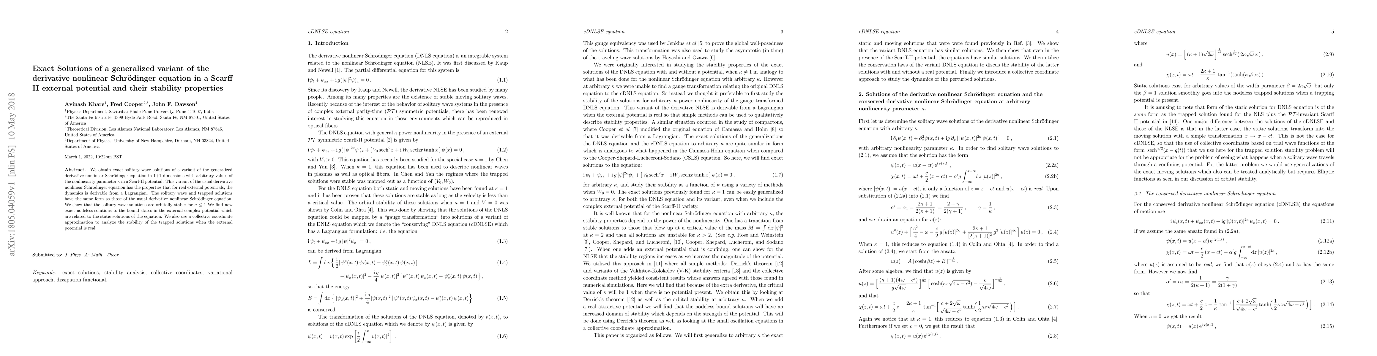 We obtain exact solitary wave solutions of a variant of the generalized derivative nonlinear Schrodinger\equation in 1+1 dimensions with arbitrary values of the nonlinearity parameter $\kappa$ in a Scarf-II potential. This variant of the usual derivative nonlinear Schrodinger equation has the properties that for real external potentials, the dynamics is derivable from a Lagrangian. The solitary wave and trapped solutions have the same form as those of the usual derivative nonlinear Schrodinger equation. We show that the solitary wave solutions are orbitally stable for $\kappa \leq 1$ We find new exact nodeless solutions to the bound states in the external complex potential which are related to the static solutions of the equation. We also use a collective coordinate approximation to analyze the stability of the trapped solutions when the external potential is real.
