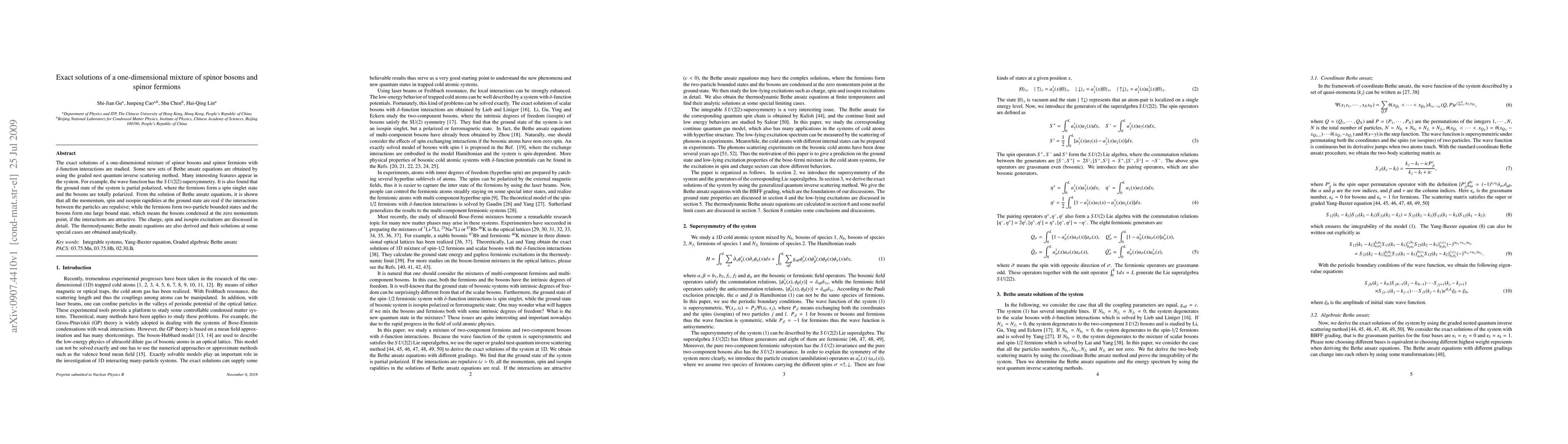 Researchers solved a complex system of particles with both spinor bosons and fermions, discovering unique properties like supersymmetry and partial polarization in the ground state. The study also explored charge and spin excitations, as well as thermodynamic equations, shedding light on the behavior of these particles under different interactions.