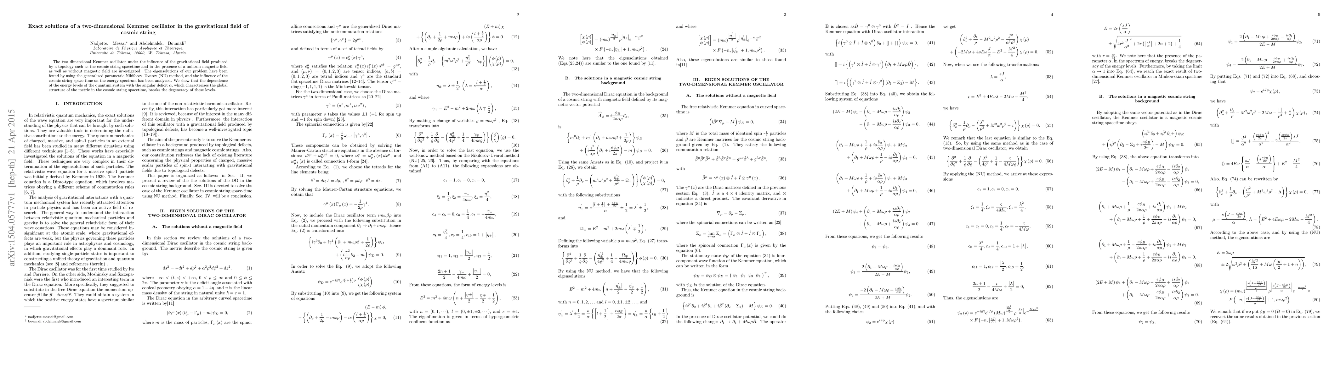 Summary: This paper investigates exact solutions for a two-dimensional Kemmer oscillator affected by a cosmic string's gravitational field, considering both scenarios with and without a uniform magnetic field.