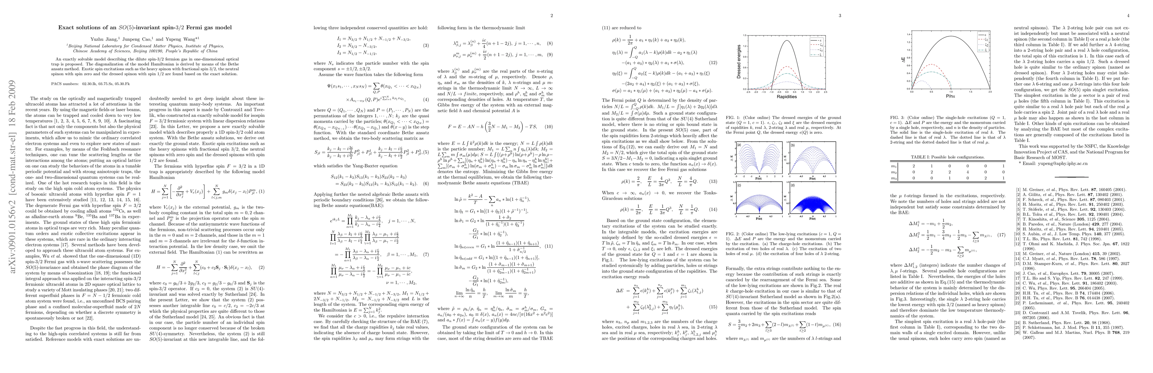 An exactly solvable model describing the dilute spin-3/2 fermion gas in one-dimensional optical trap is proposed. The diagonalization of the model Hamiltonian is derived by means of the Bethe ansatz method. Exotic spin excitations such as the heavy spinon with fractional spin 3/2, the neutral spinon with spin zero and the dressed spinon with spin 1/2 are found based on the exact solution.