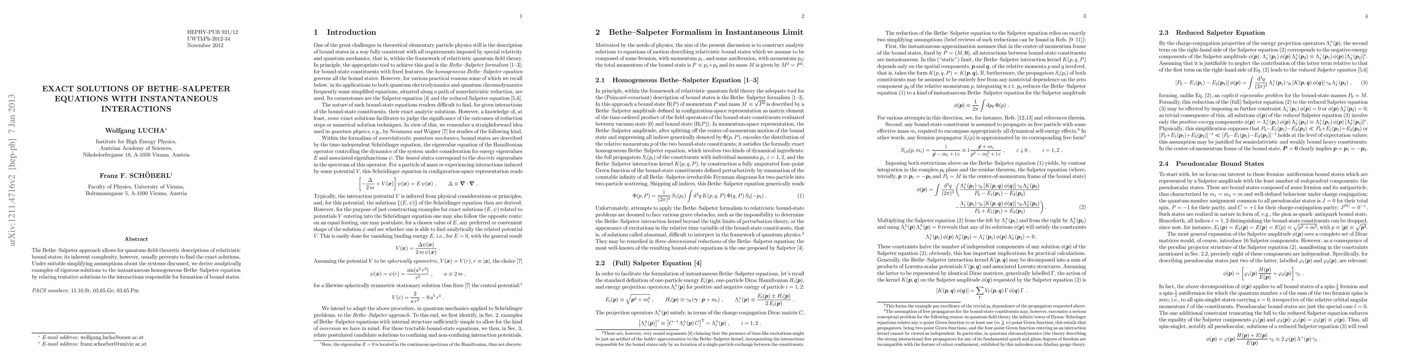 This paper presents exact solutions to the instantaneous homogeneous Bethe-Salpeter equation for relativistic bound states under simplifying assumptions, providing a rigorous analytical framework for understanding the interactions forming these states. The approach relates derived solutions to the underlying interactions.