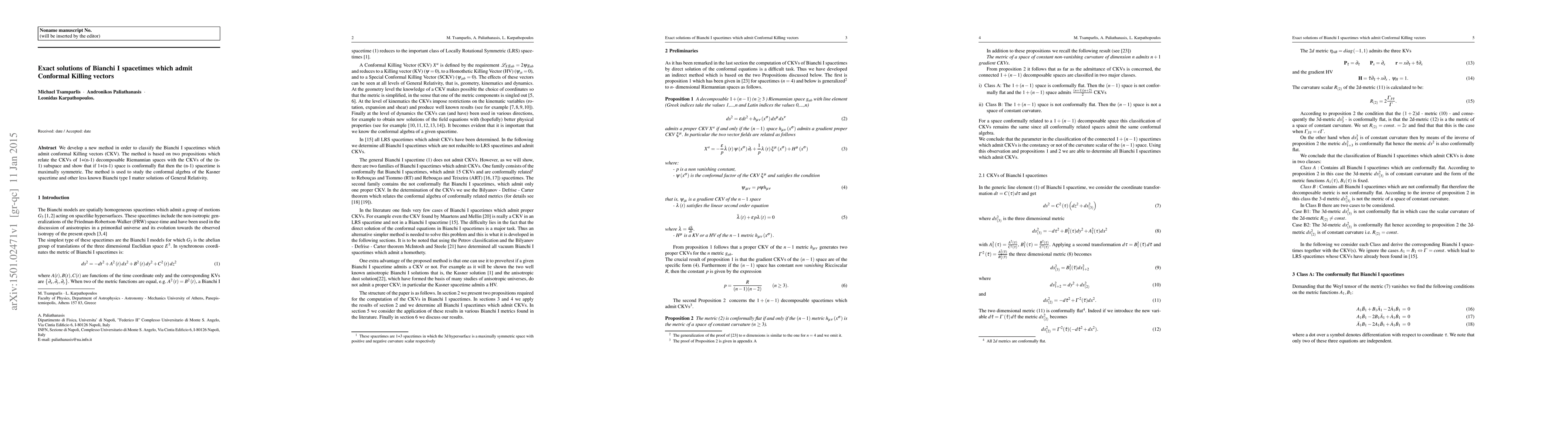 We develop a new method in order to classify the Bianchi I spacetimes which admit conformal Killing vectors (CKV). The method is based on two propositions which relate the CKVs of 1+(n-1) decomposable Riemannian spaces with the CKVs of the (n-1) subspace and show that if 1+(n-1) space is conformally flat then the (n-1) spacetime is maximally symmetric. The method is used to study the conformal algebra of the Kasner spacetime and other less known Bianchi type I matter solutions of General Relativity.