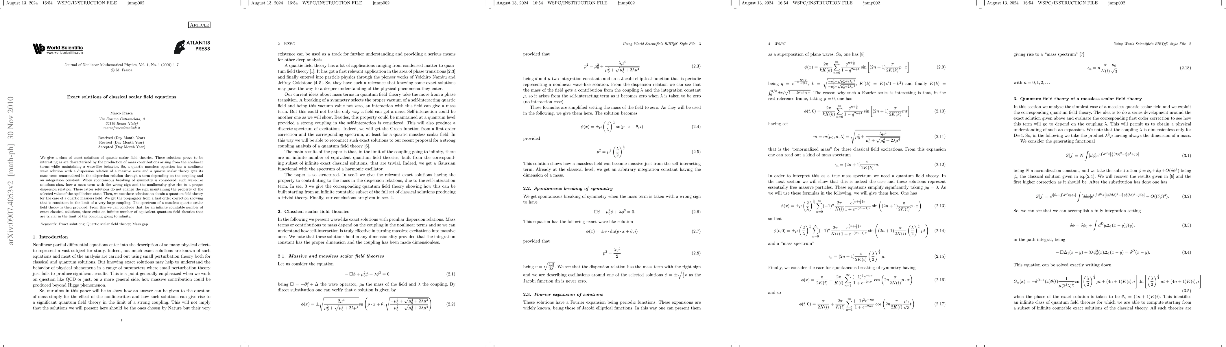We give a class of exact solutions of quartic scalar field theories. These solutions prove to be interesting as are characterized by the production of mass contributions arising from the nonlinear terms while maintaining a wave-like behavior. So, a quartic massless equation has a nonlinear wave solution with a dispersion relation of a massive wave and a quartic scalar theory gets its mass term renormalized in the dispersion relation through a term depending on the coupling and an integration constant. When spontaneous breaking of symmetry is considered, such wave-like solutions show how a mass term with the wrong sign and the nonlinearity give rise to a proper dispersion relation. These latter solutions do not change the sign maintaining the property of the selected value of the equilibrium state. Then, we use these solutions to obtain a quantum field theory for the case of a quartic massless field. We get the propagator from a first order correction showing that is consistent in the limit of a very large coupling. The spectrum of a massless quartic scalar field theory is then provided. From this we can conclude that, for an infinite countable number of exact classical solutions, there exist an infinite number of equivalent quantum field theories that are trivial in the limit of the coupling going to infinity.