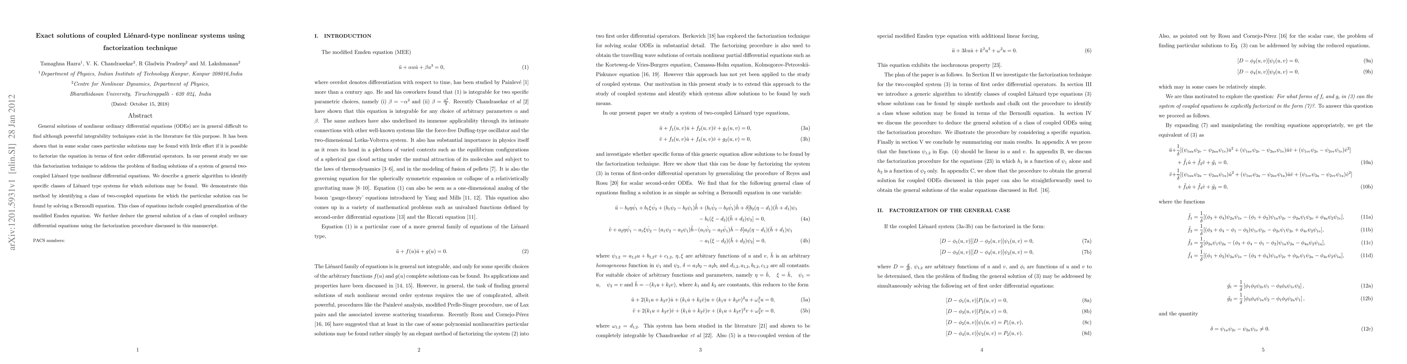 This paper presents a factorization technique for finding exact solutions to coupled Liénard-type nonlinear systems. The authors develop a generic algorithm to identify specific classes of such systems that can be solved by reducing them to Bernoulli equations, demonstrating the method on a class that includes the coupled modified Emden equation.