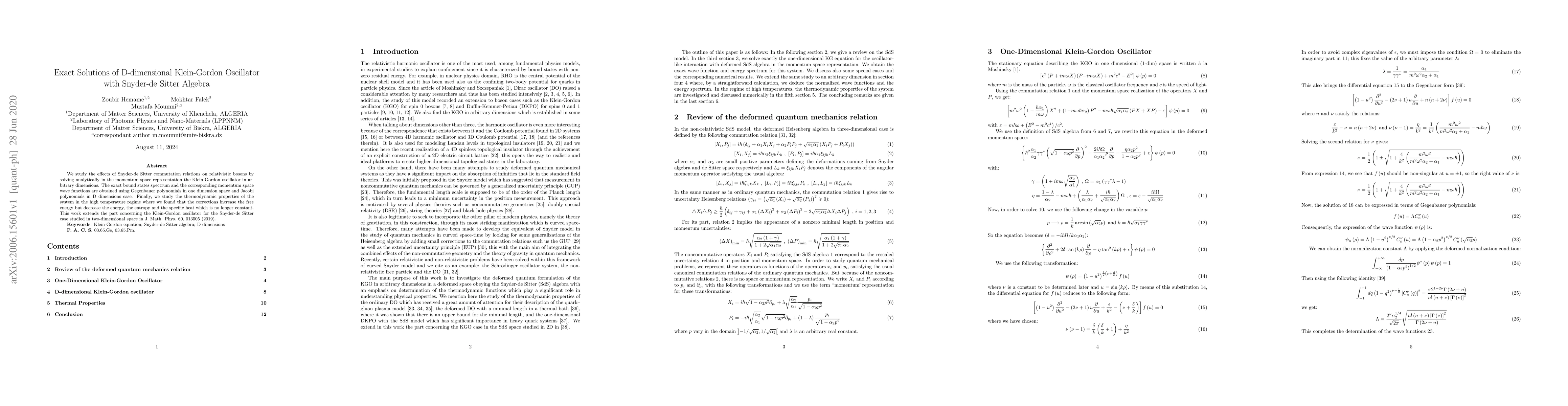 This paper analytically solves the D-dimensional Klein-Gordon oscillator under Snyder-de Sitter algebra, obtaining exact bound states and wave functions using Gegenbauer and Jacobi polynomials. It also investigates thermodynamic properties, finding that corrections increase free energy but decrease entropy and specific heat.