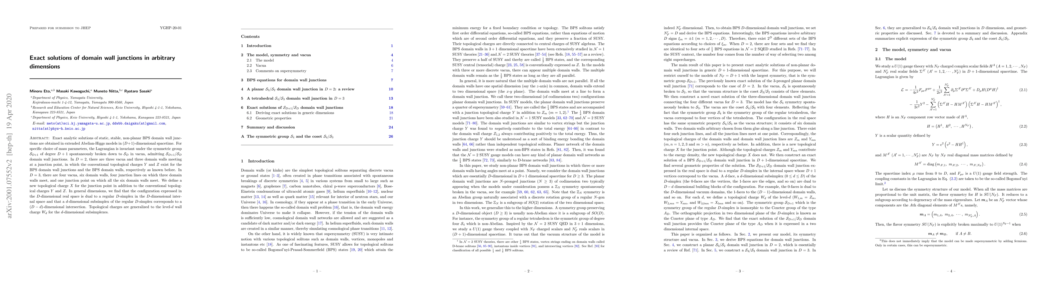 This paper presents exact analytic solutions for static, stable, non-planar BPS domain wall junctions in extended Abelian-Higgs models across arbitrary dimensions. It introduces new topological charges for junction points in higher dimensions and generalizes the configuration to a dual relationship between real and internal spaces.
