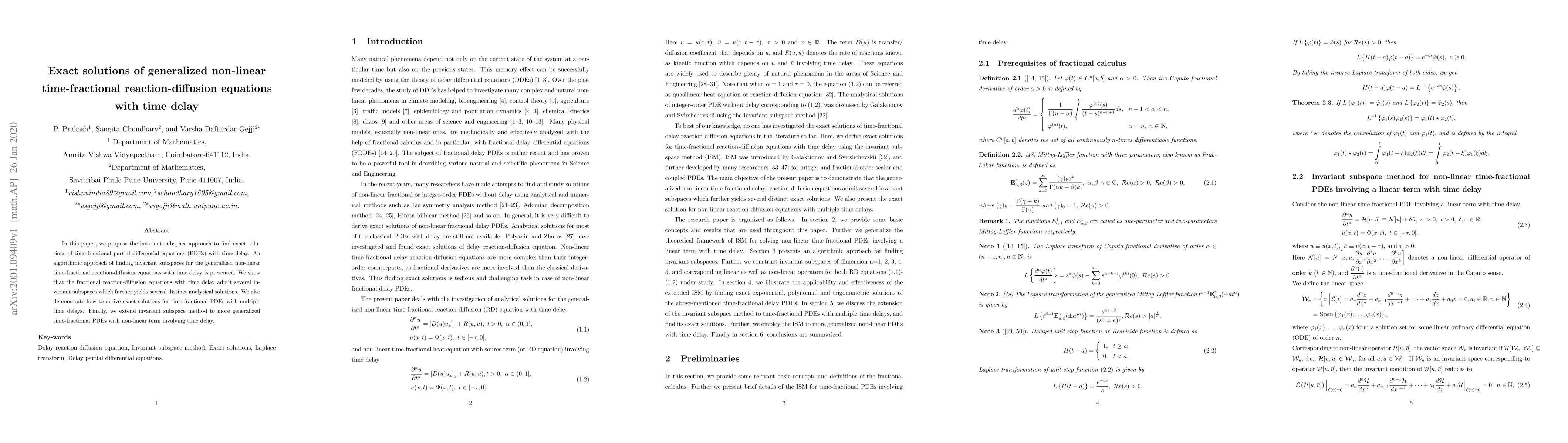 This paper utilizes the invariant subspace approach to derive exact solutions for generalized non-linear time-fractional reaction-diffusion equations with time delay. It presents an algorithmic method to identify invariant subspaces, leading to distinct analytical solutions and extending the method to more complex PDEs with multiple time delays.