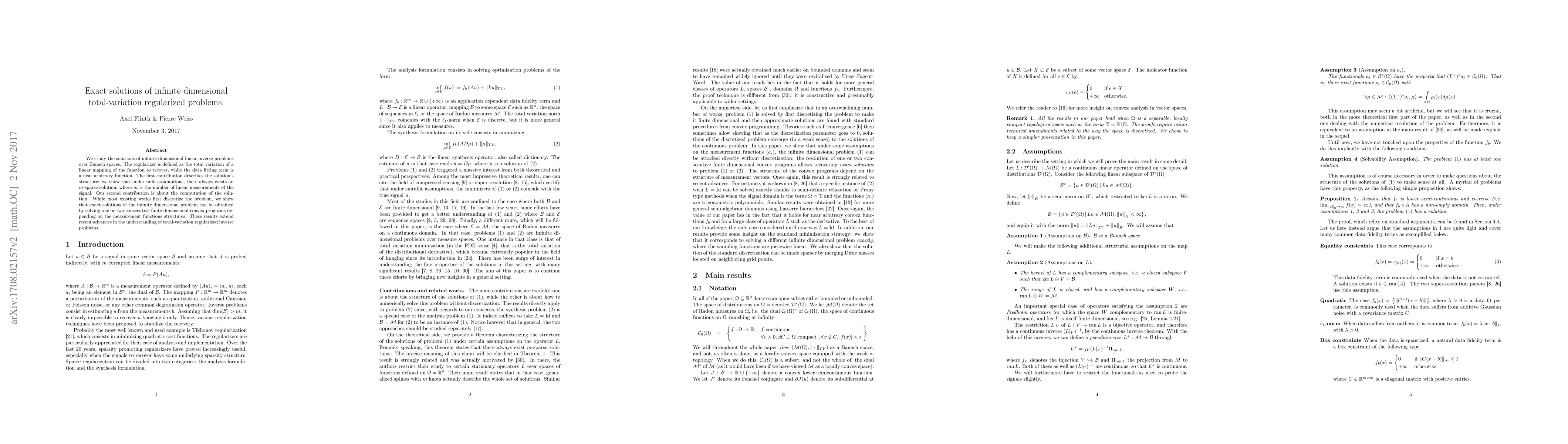 This paper investigates infinite dimensional linear inverse problems with total variation regularization and an arbitrary convex data fitting term. It demonstrates the existence of m-sparse solutions under suitable conditions and presents a method for computing exact solutions via two consecutive finite dimensional convex programs, bypassing the need for discretization.