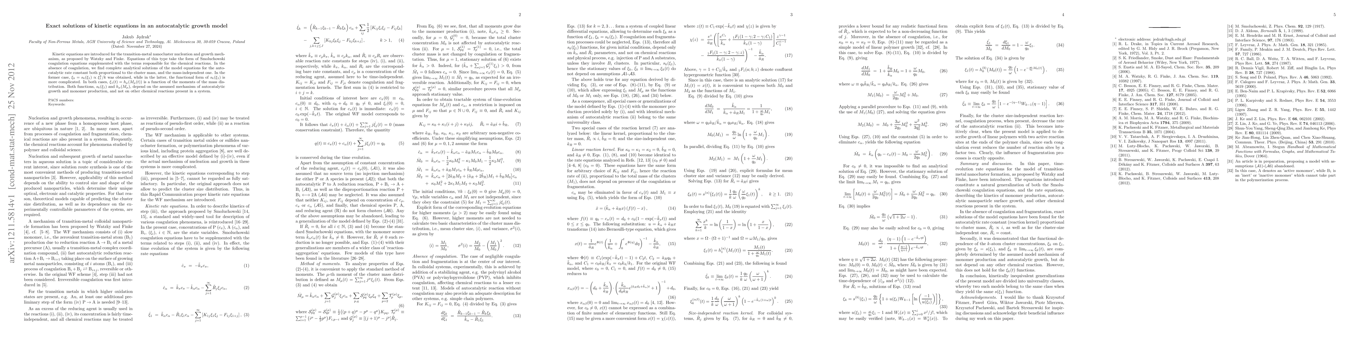 Kinetic equations are introduced for the transition-metal nanocluster nucleation and growth mechanism, as proposed by Watzky and Finke. Equations of this type take the form of Smoluchowski coagulation equations supplemented with the terms responsible for the chemical reactions. In the absence of coagulation, we find complete analytical solutions of the model equations for the autocatalytic rate constant both proportional to the cluster mass, and the mass-independent one. In the former case, $\xi_{k} = s_k(\xi_{1})\propto \xi_{1}^{k}/k $ was obtained, while in the latter, the functional form of $s_k(\xi_{1})$ is more complicated. In both cases, $\xi_{1}(t) = h_{\mu}(M_{\mu}(t))$ is a function of the moments of the mass distribution. Both functions, $s_k(\xi_{1})$ and $h_{\mu}(M_{\mu})$, depend on the assumed mechanism of autocatalytic growth and monomer production, and not on other chemical reactions present in a system.