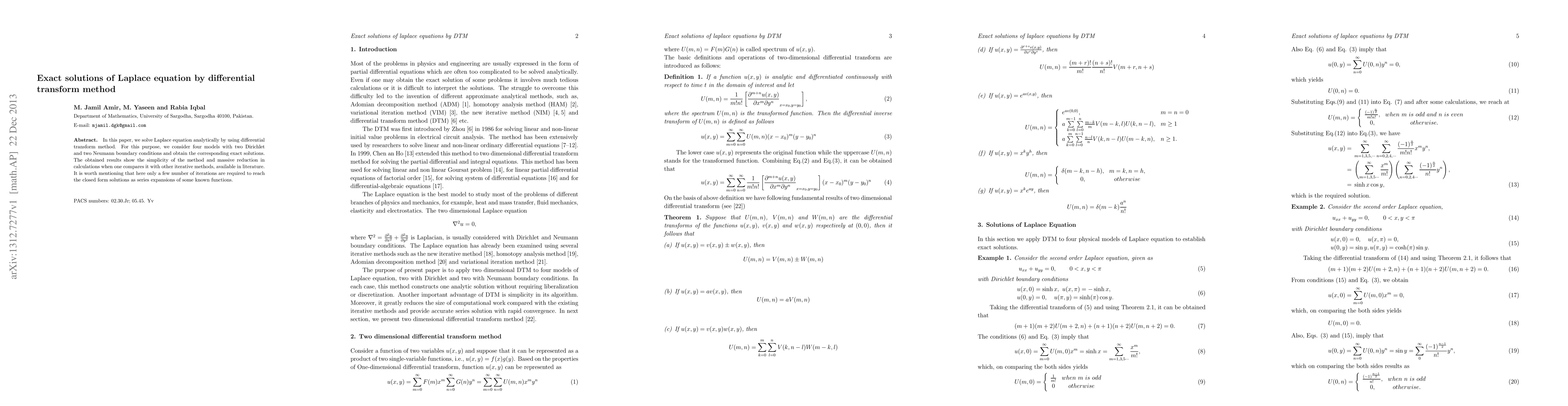 This paper presents an analytical solution to the Laplace equation using the differential transform method, obtaining exact solutions for four models with Dirichlet and Neumann boundary conditions. The method demonstrates simplicity and significantly reduces computational effort compared to iterative methods.