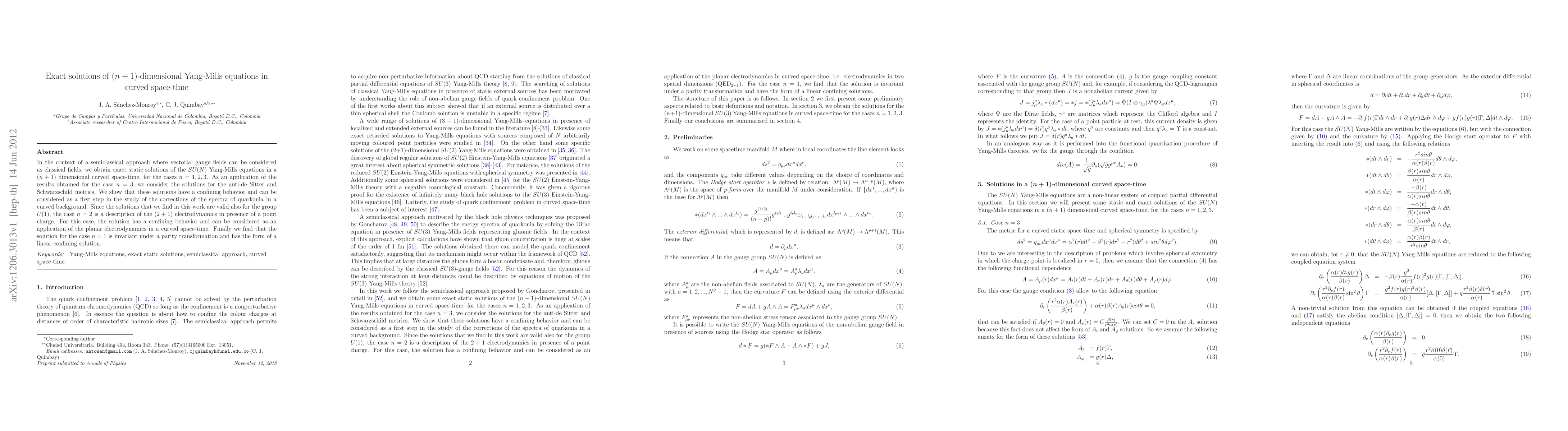 In the context of a semiclassical approach where vectorial gauge fields can be considered as classical fields, we obtain exact static solutions of the SU(N) Yang-Mills equations in a $(n+1)$ dimensional curved space-time, for the cases $n = 1, 2, 3$. As an application of the results obtained for the case $n=3$, we consider the solutions for the anti-de Sitter and Schwarzschild metrics. We show that these solutions have a confining behavior and can be considered as a first step in the study of the corrections of the spectra of quarkonia in a curved background. Since the solutions that we find in this work are valid also for the group U(1), the case $n=2$ is a description of the $(2+1)$ electrodynamics in presence of a point charge. For this case, the solution has a confining behavior and can be considered as an application of the planar electrodynamics in a curved space-time. Finally we find that the solution for the case $n=1$ is invariant under a parity transformation and has the form of a linear confining solution.