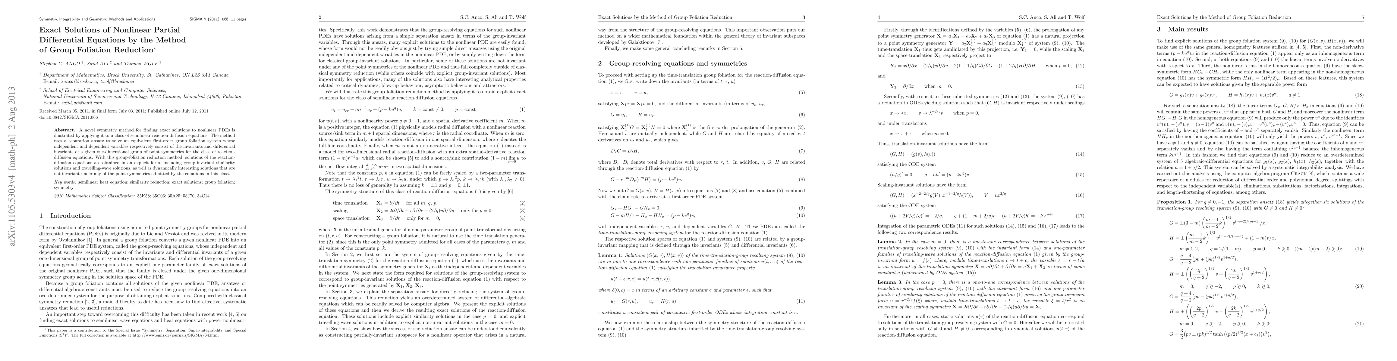 A novel symmetry method for finding exact solutions to nonlinear PDEs is illustrated by applying it to a semilinear reaction-diffusion equation in multi-dimensions. The method uses a separation ansatz to solve an equivalent first-order group foliation system whose independent and dependent variables respectively consist of the invariants and differential invariants of a given one-dimensional group of point symmetries for the reaction-diffusion equation. With this group-foliation reduction method, solutions of the reaction-diffusion equation are obtained in an explicit form, including group-invariant similarity solutions and travelling-wave solutions, as well as dynamically interesting solutions that are not invariant under any of the point symmetries admitted by this equation.