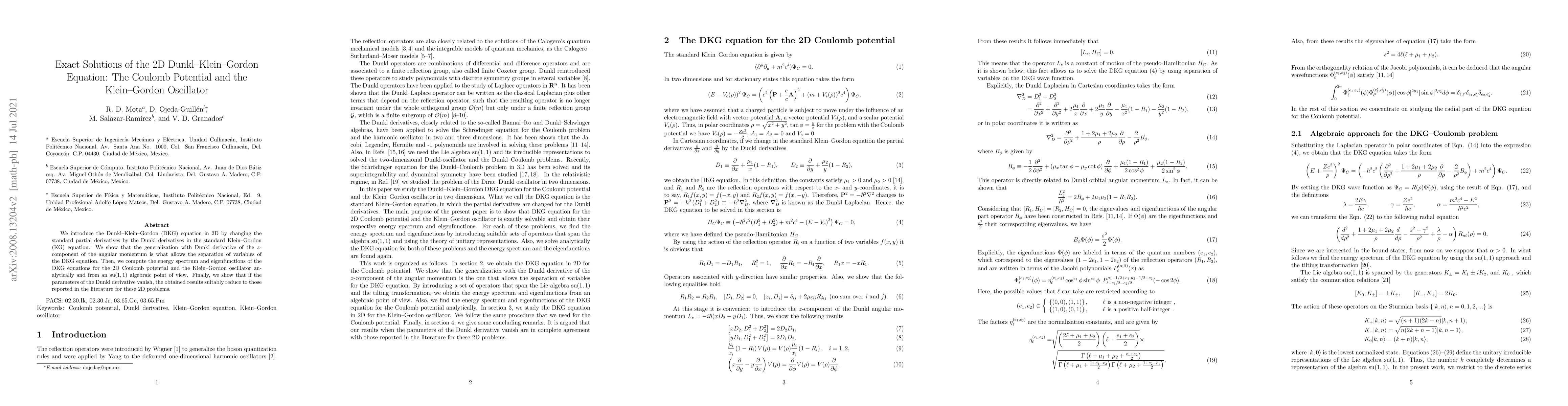 We introduce the Dunkl--Klein--Gordon (DKG) equation in 2D by changing the standard partial derivatives by the Dunkl derivatives in the standard Klein--Gordon (KG) equation. We show that the generalization with Dunkl derivative of the $z$-component of the angular momentum is what allows the separation of variables of the DKG equation. Then, we compute the energy spectrum and eigenfunctions of the DKG equations for the 2D Coulomb potential and the Klein--Gordon oscillator analytically and from an ${\rm su}(1,1)$ algebraic point of view. Finally, we show that if the parameters of the Dunkl derivative vanish, the obtained results suitably reduce to those reported in the literature for these 2D problems.