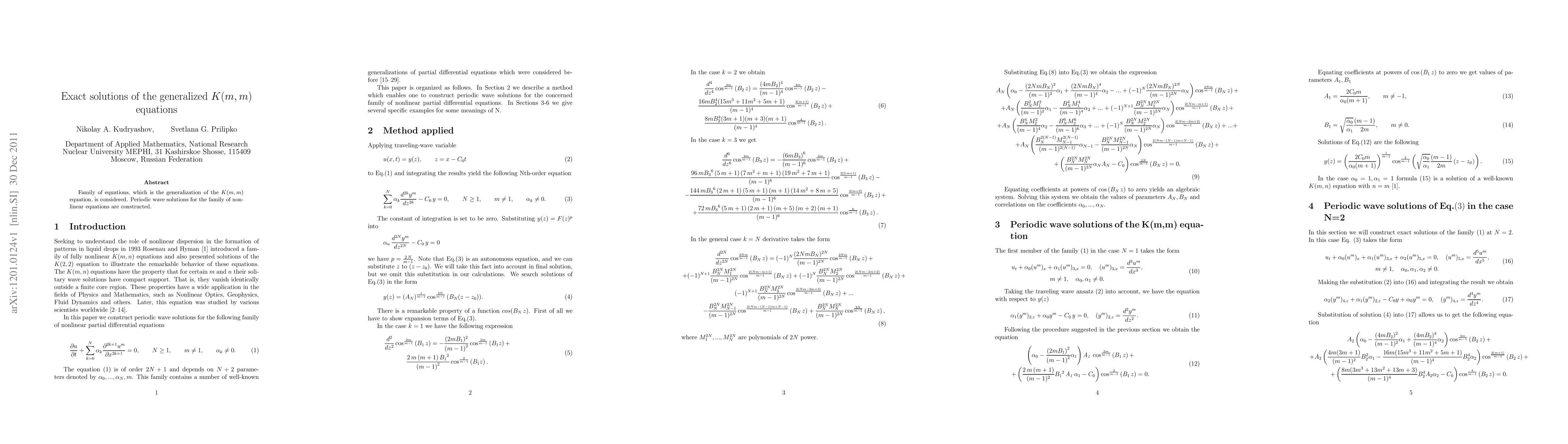 This research paper presents exact periodic wave solutions for a generalized family of nonlinear equations, known as the K(m,m) equations, using advanced mathematical techniques.