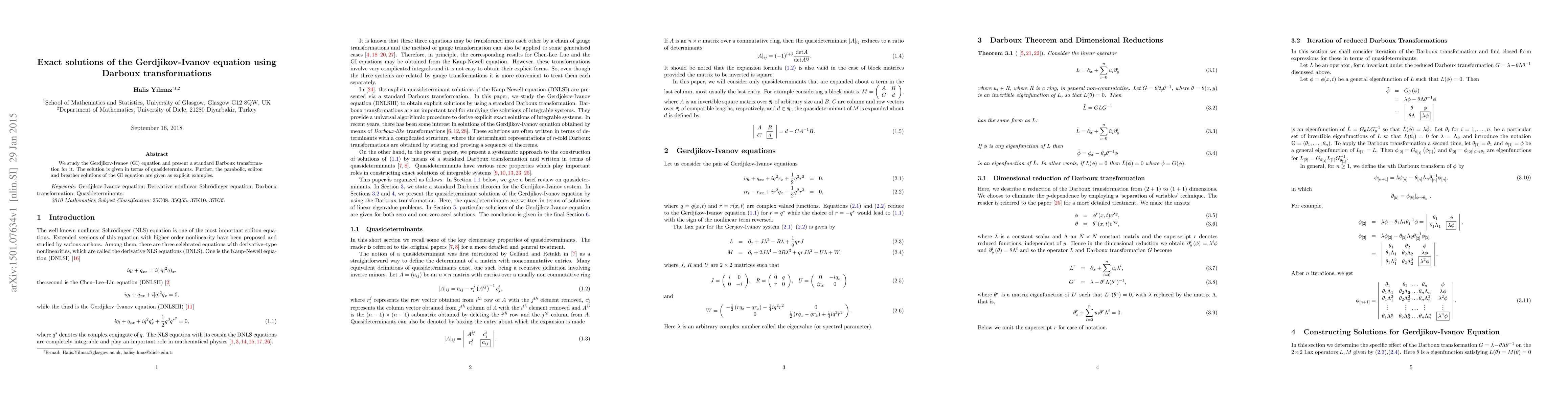 This paper presents a Darboux transformation for the Gerdjikov-Ivanov equation, providing exact solutions in terms of quasideterminants. It explicitly demonstrates parabolic, soliton, and breather solutions as examples.