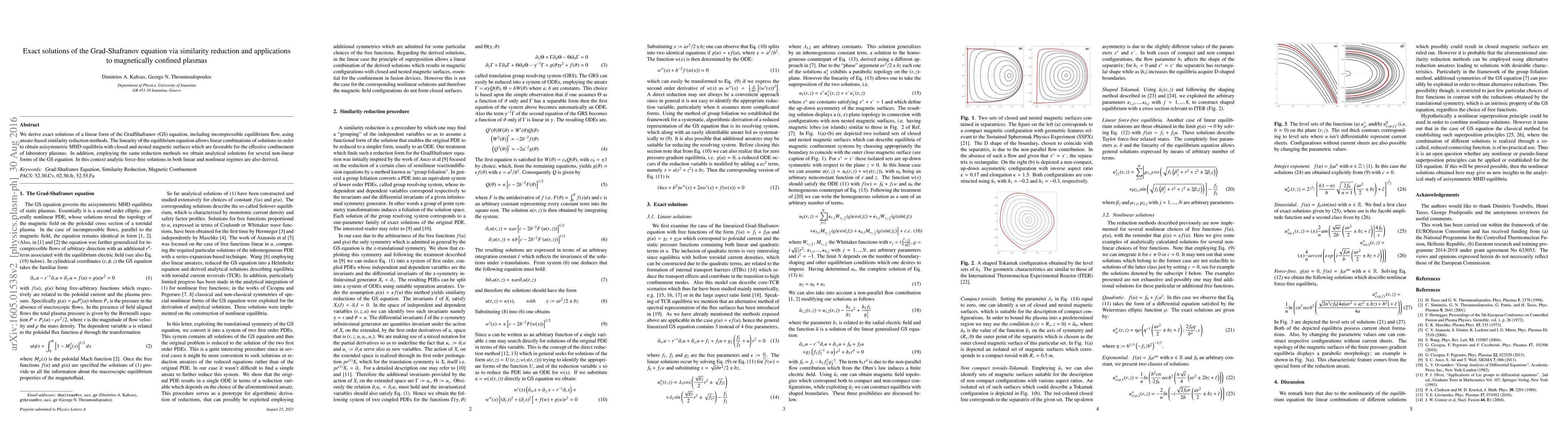 This paper derives exact solutions for the Grad-Shafranov equation using similarity reduction methods, which facilitate the construction of axisymmetric MHD equilibria with closed magnetic surfaces beneficial for plasma confinement. It also provides analytical solutions for both linear and non-linear forms of the equation, including force-free solutions.