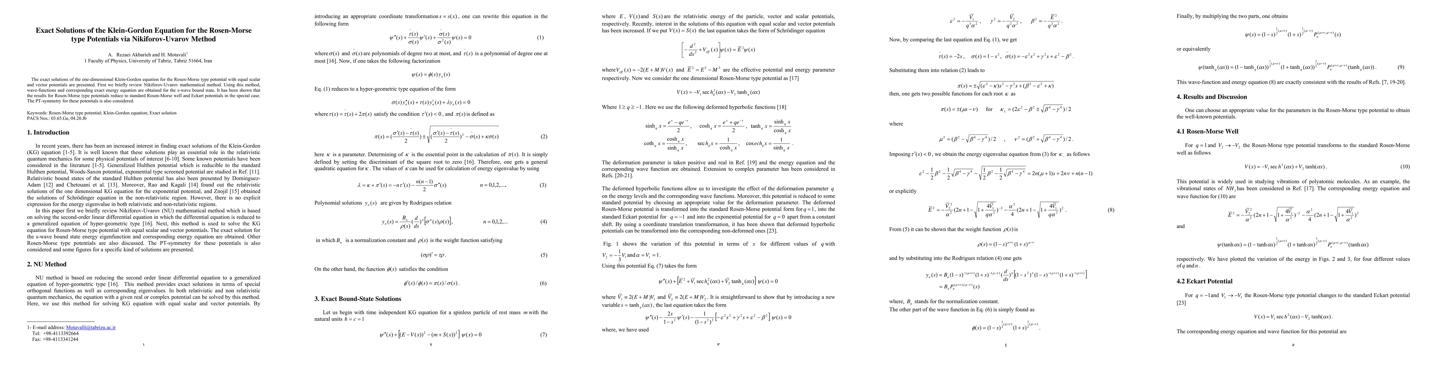 This paper presents exact solutions for the Klein-Gordon equation under Rosen-Morse type potentials using the Nikiforov-Uvarov method, deriving wave-functions and energy equations for s-wave bound states, and discusses the PT-symmetry and special case reductions to standard potentials.
