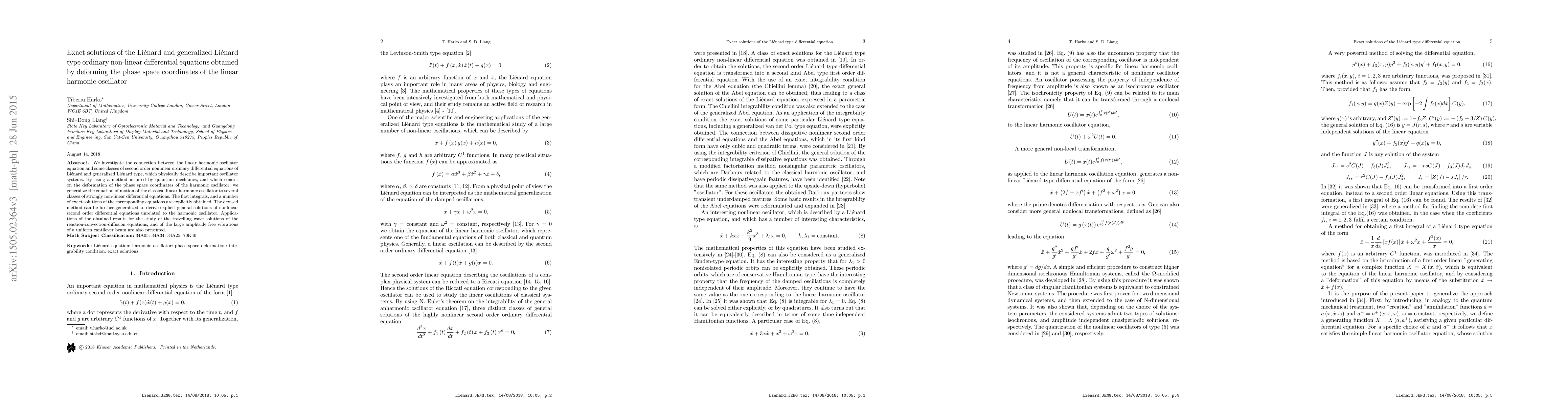 This paper explores the relationship between the linear harmonic oscillator and nonlinear differential equations of Lienard type, using a method that deforms the phase space coordinates. It derives exact solutions and first integrals for these equations, with applications to reaction-convection-diffusion equations and large amplitude free vibrations in beams.