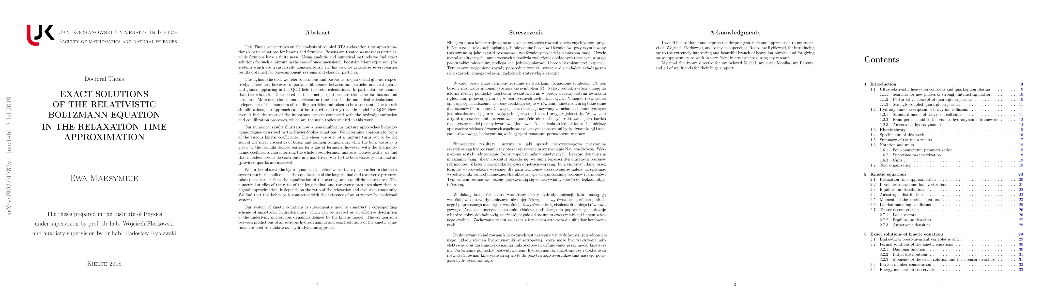 This Thesis concentrates on the analysis of coupled RTA (relaxation time approximation) kinetic equations for bosons and fermions. Bosons are treated as massless particles, while fermions have a finite mass. Using analytic and numerical methods we find exact solutions for such a mixture in the case of one-dimensional, boost-invariant expansion (for systems which are transversally homogeneous). In this way, several earlier results obtained for one-component systems and classical particles are generalized.