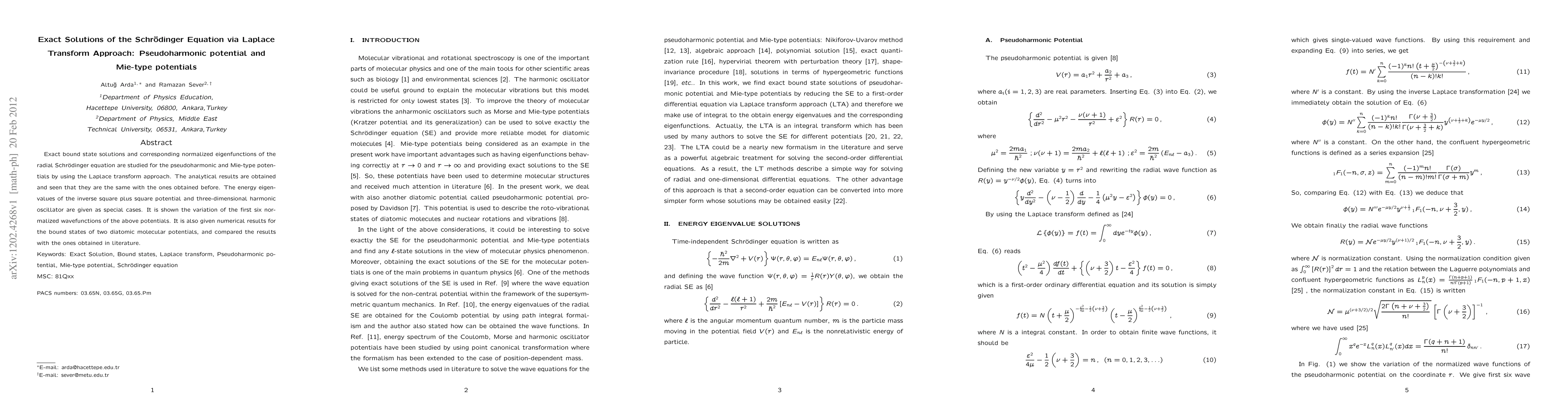 This paper presents exact bound state solutions and normalized eigenfunctions of the radial Schrödinger equation using the Laplace transform for pseudoharmonic and Mie-type potentials. Analytical results are verified and compared with previous findings, demonstrating the method's effectiveness through special cases and numerical results for diatomic molecular potentials.