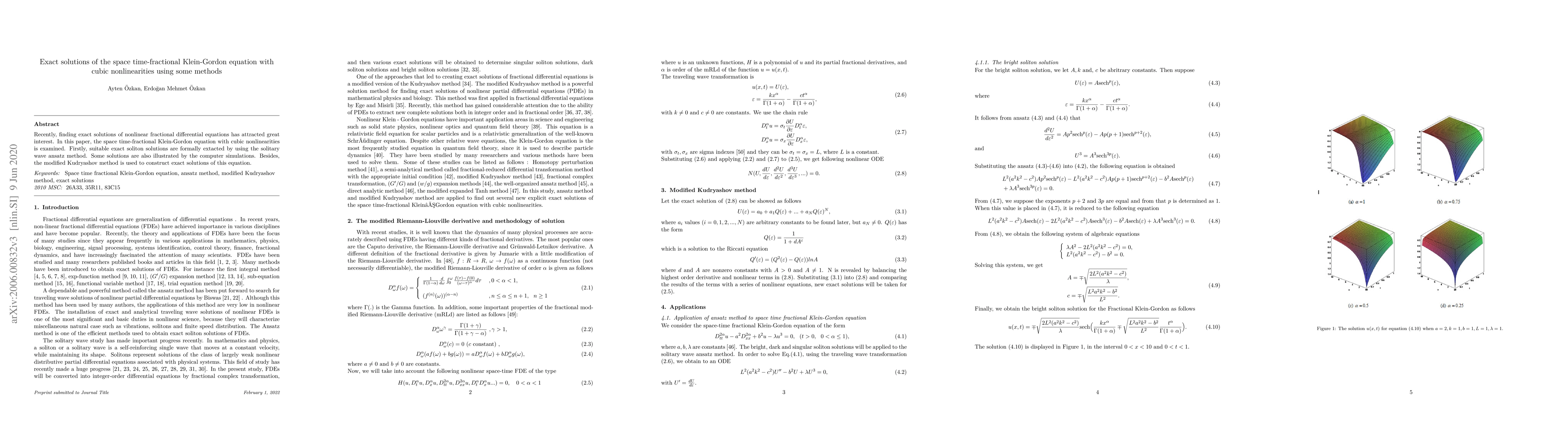 This paper investigates exact solutions for the space time-fractional Klein-Gordon equation with cubic nonlinearities, employing the solitary wave ansatz method and the modified Kudryashov method to derive soliton solutions, supplemented by computer simulations for illustration.