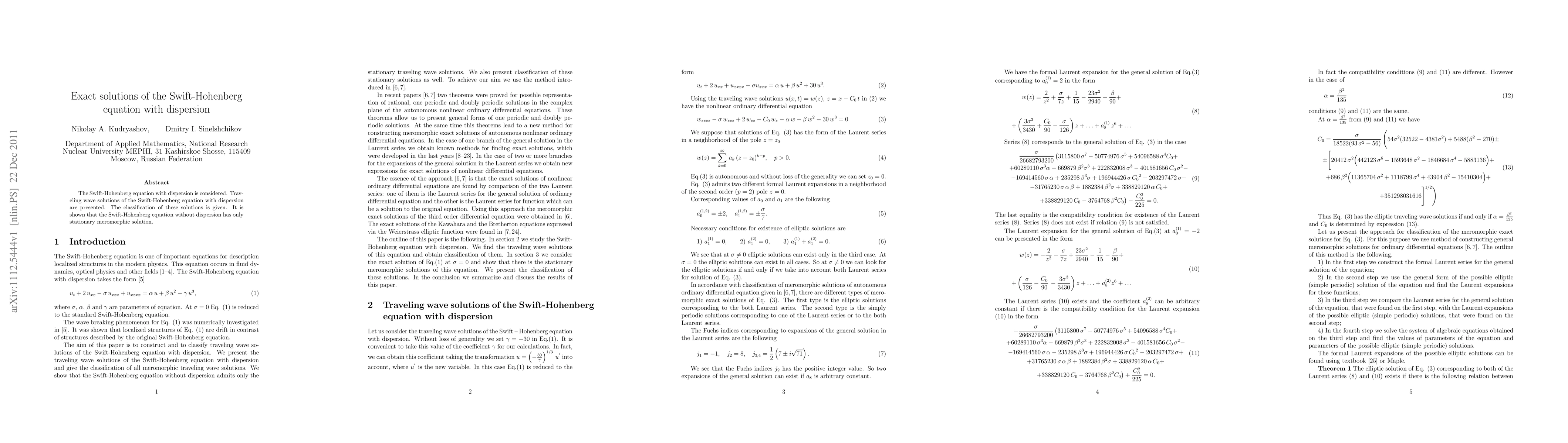 Summary: This paper presents traveling wave solutions for the Swift-Hohenberg equation with dispersion and classifies these solutions. It contrasts by showing that the Swift-Hohenberg equation without dispersion only admits stationary meromorphic solutions.