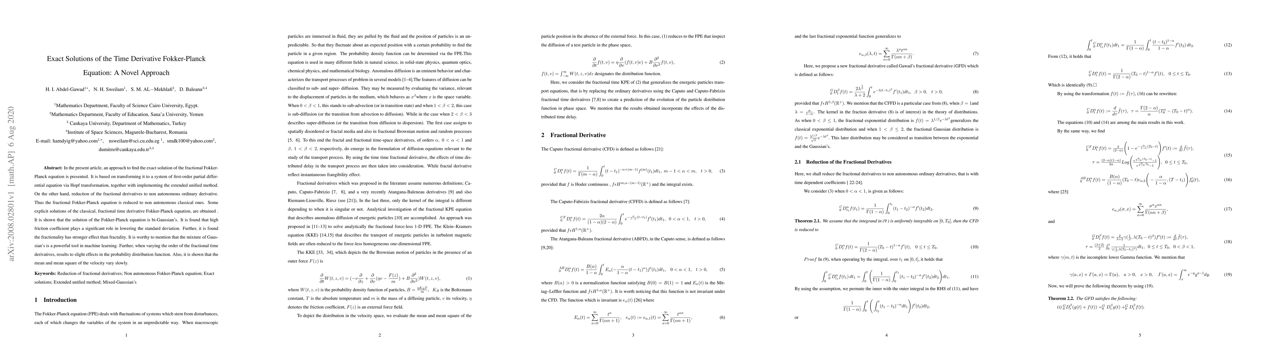 In the present article, an approach to find the exact solution of the fractional Fokker-Planck equation is presented. It is based on transforming it to a system of first-order partial differential equation via Hopf transformation, together with implementing the extended unified method. On the other hand, reduction of the fractional derivatives to non autonomous ordinary derivative. Thus the fractional Fokker-Planck equation is reduced to non autonomous classical ones. Some explicit solutions of the classical, fractional time derivative Fokker-Planck equation, are obtained . It is shown that the solution of the Fokker-Planck equation is bi-Gaussian's. It is found that high friction coefficient plays a significant role in lowering the standard deviation. Further, it is found the fractionality has stronger effect than fractality. It is worthy to mention that the mixture of Gaussian's is a powerful tool in machine learning. Further, when varying the order of the fractional time derivatives, results to slight effects in the probability distribution function. Also, it is shown that the mean and mean square of the velocity vary slowly.