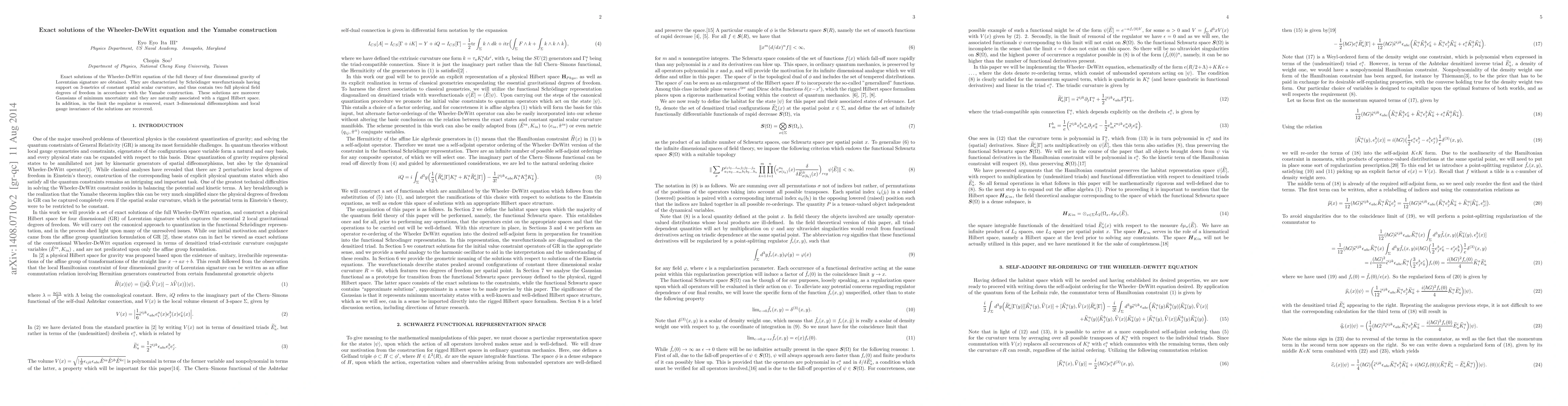 This paper provides exact solutions to the Wheeler-DeWitt equation for four-dimensional gravity, characterized by Gaussian wavefunctionals supported on 3-metrics with constant scalar curvature, aligning with the Yamabe construction. These solutions exhibit minimal uncertainty and are linked to a rigged Hilbert space, while also demonstrating diffeomorphism and gauge invariance in the limit of removing the regulator.