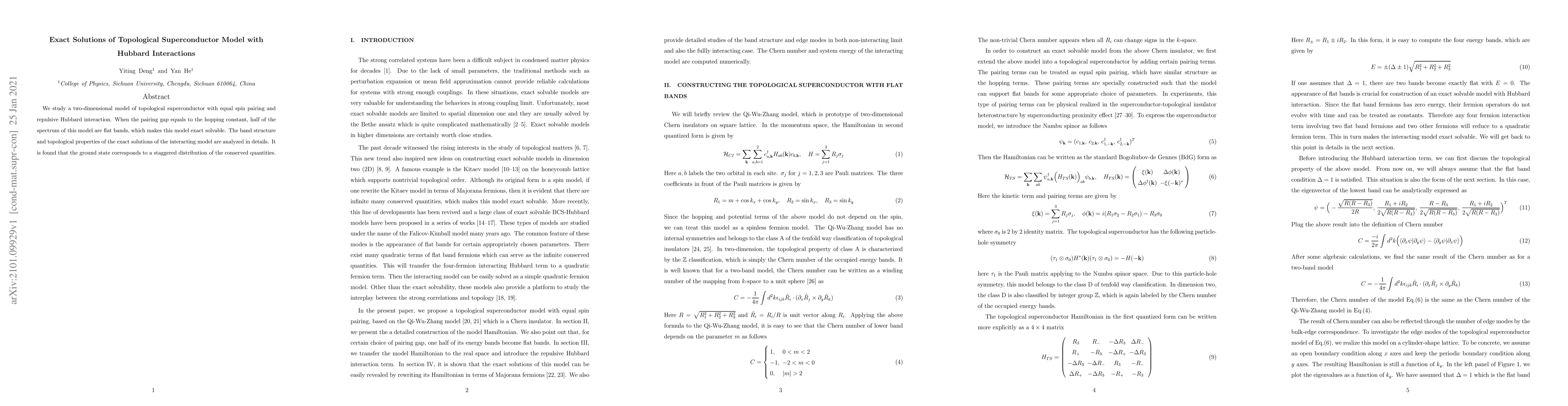 This research presents an exact solution for a 2D topological superconductor model featuring equal spin pairing and repulsive Hubbard interaction. When the pairing gap matches the hopping constant, flat bands emerge, making the model solvable. The study reveals the band structure, topological properties, and a staggered distribution of conserved quantities in the ground state.