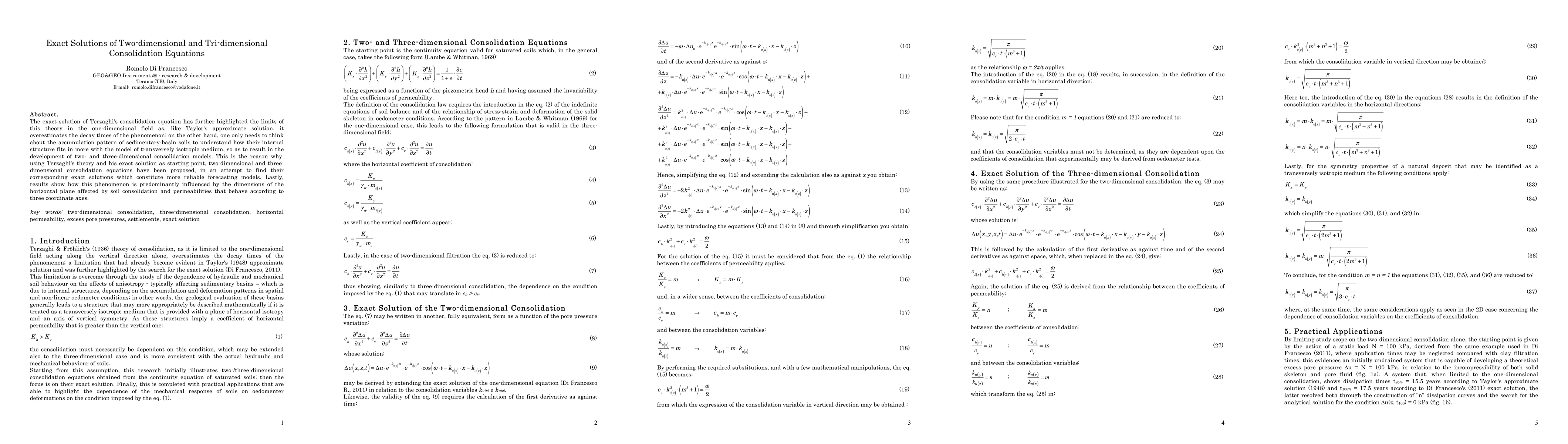 The exact solution of Terzaghi's consolidation equation has further highlighted the limits of this theory in the one-dimensional field as, like Taylor's approximate solution, it overestimates the decay times of the phenomenon; on the other hand, one only needs to think about the accumulation pattern of sedimentary-basin soils to understand how their internal structure fits in more with the model of transversely isotropic medium, so as to result in the development of two- and three-dimensional consolidation models. This is the reason why, using Terzaghi's theory and his exact solution as starting point, two-dimensional and three-dimensional consolidation equations have been proposed, in an attempt to find their corresponding exact solutions which constitute more reliable forecasting models. Lastly, results show how this phenomenon is predominantly influenced by the dimensions of the horizontal plane affected by soil consolidation and permeabilities that behave according to three coordinate axes.