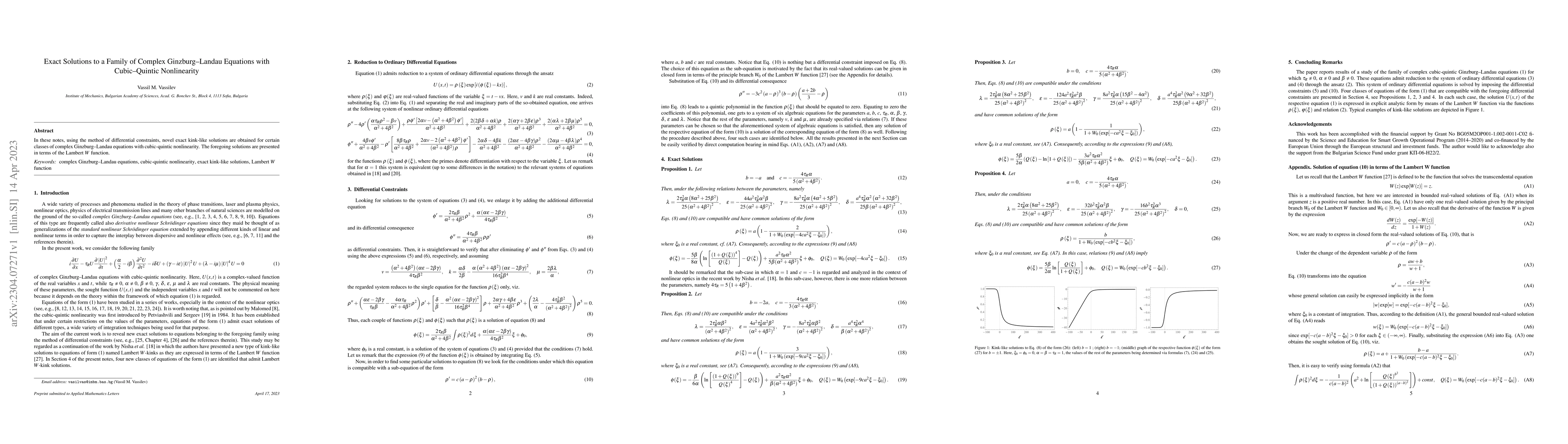 Summary: This paper uses the method of differential constraints to derive novel exact kink-like solutions for complex Ginzburg-Landau equations featuring cubic-quintic nonlinearity, expressed via the Lambert W function.