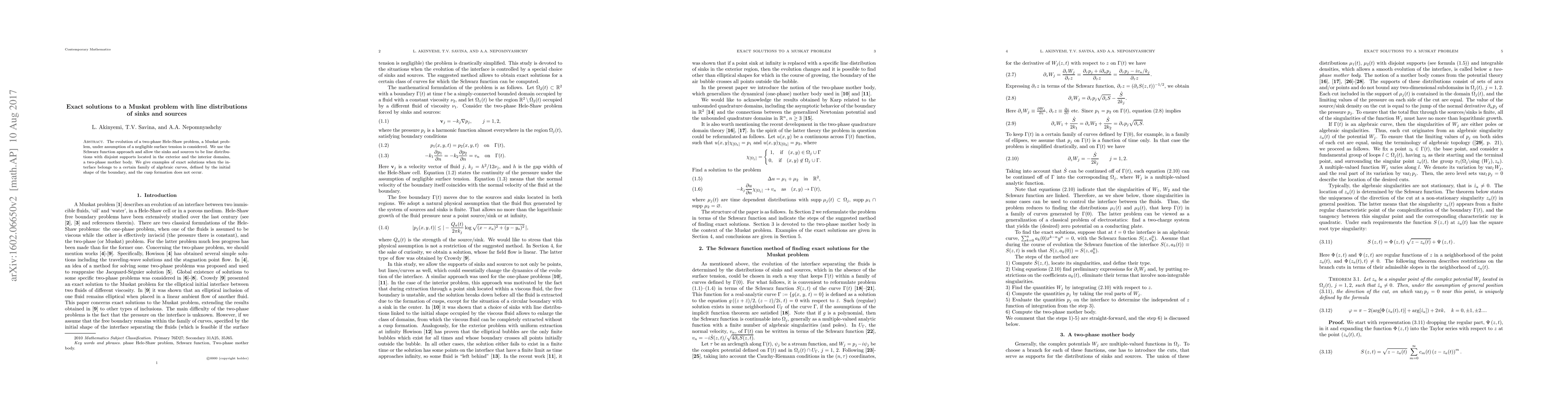 The evolution of a two-phase Hele-Shaw problem, a Muskat problem, under assumption of a negligible surface tension is considered. We use the Schwarz function approach and allow the sinks and sources to be line distributions with disjoint supports located in the exterior and the interior domains, a two-phase mother body. We give examples of exact solutions when the interface belongs to a certain family of algebraic curves, defined by the initial shape of the boundary, and the cusp formation does not occur.