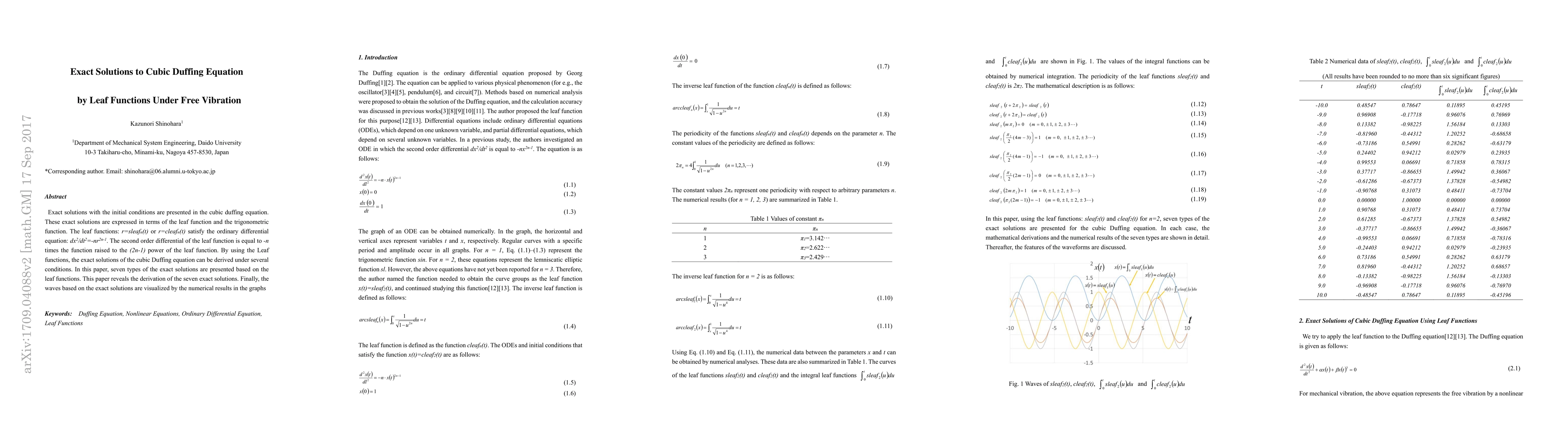 Researchers found exact solutions to the cubic Duffing equation using leaf functions under free vibration, revealing seven types of solutions that can be derived based on these functions.