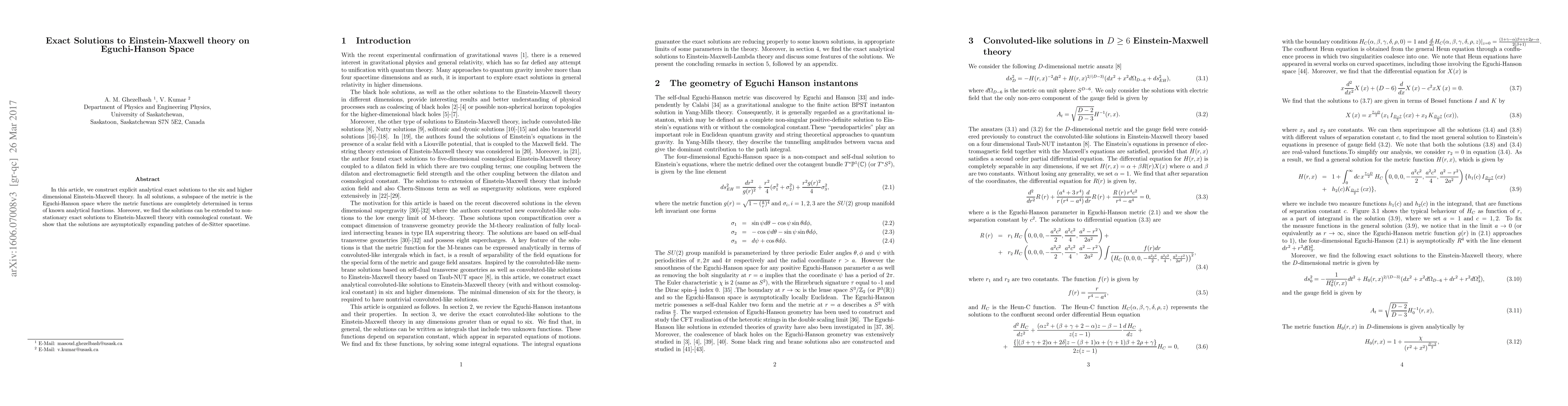 In this article, we construct explicit analytical exact solutions to the six and higher dimensional Einstein-Maxwell theory. In all solutions, a subspace of the metric is the Eguchi-Hanson space where the metric functions are completely determined in terms of known analytical functions. Moreover, we find the solutions can be extended to non-stationary exact solutions to Einstein-Maxwell theory with cosmological constant. We show that the solutions are asymptotically expanding patches of de-Sitter spacetime.