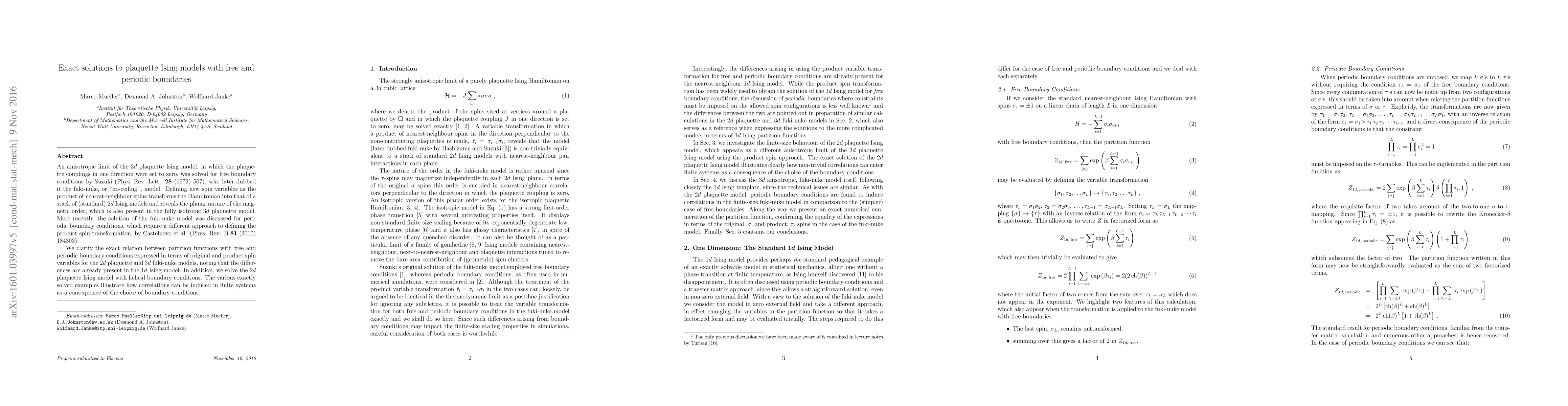 This paper solves the anisotropic 3d plaquette Ising model, known as the fuki-nuke model, for both free and periodic boundary conditions, clarifying the exact relation between partition functions in these settings. It also solves the 2d plaquette Ising model with helical boundary conditions, demonstrating how boundary conditions influence magnetic correlations.