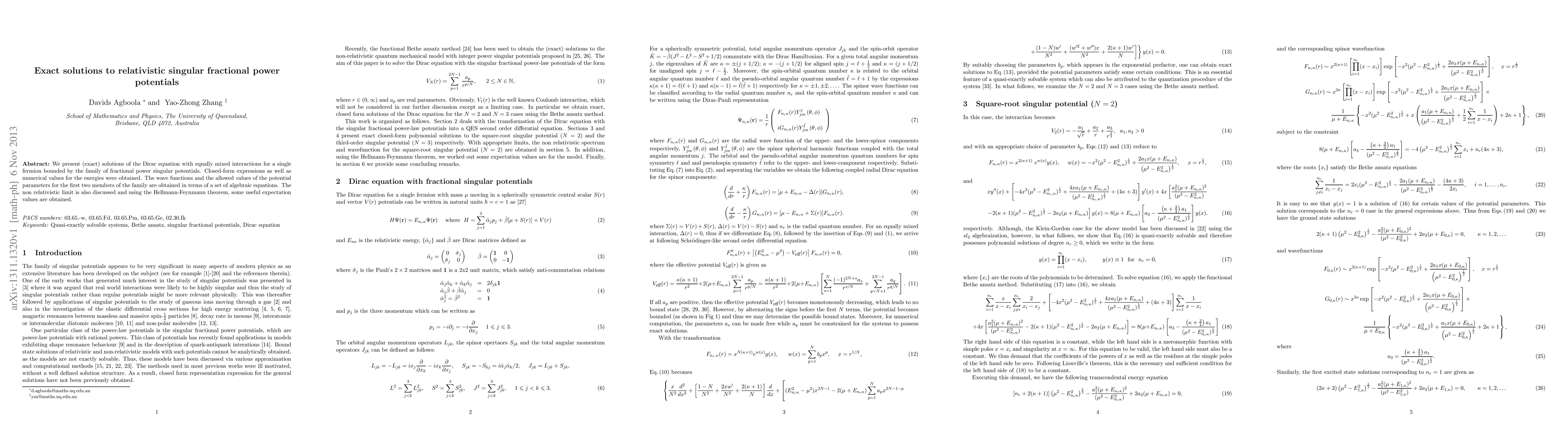 Researchers found exact solutions to a complex equation involving relativistic singular fractional power potentials, providing closed-form expressions and numerical values for energies and wave functions.