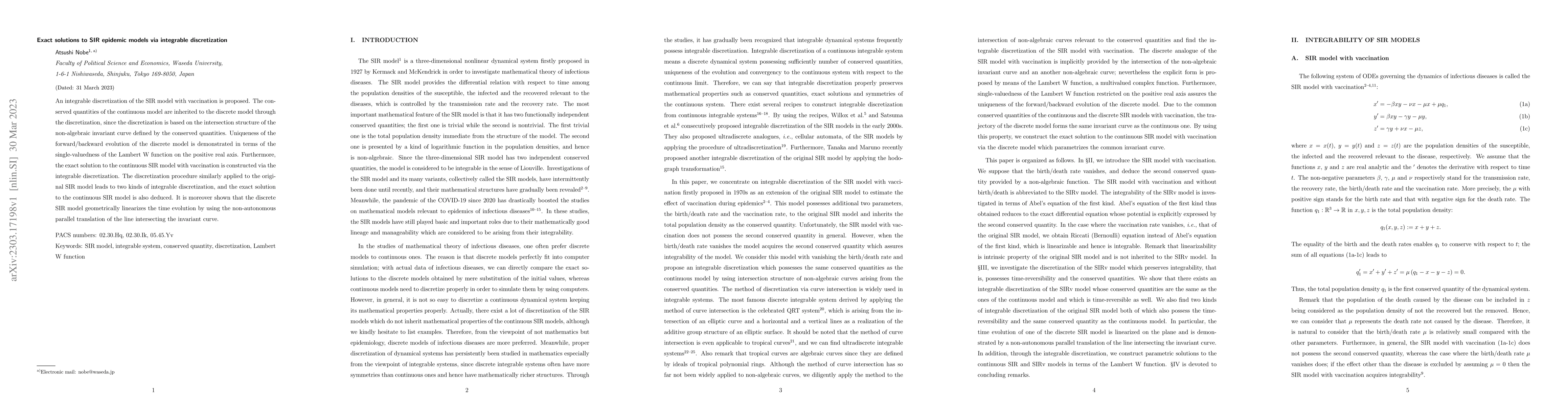 An integrable discretization of the SIR model with vaccination is proposed. The conserved quantities of the continuous model are inherited to the discrete model through the discretization, since the discretization is based on the intersection structure of the non-algebraic invariant curve defined by the conserved quantities. Uniqueness of the forward/backward evolution of the discrete model is demonstrated in terms of the single-valuedness of the Lambert W function on the positive real axis. Furthermore, the exact solution to the continuous SIR model with vaccination is constructed via the integrable discretization. The discretization procedure similarly applied to the original SIR model leads to two kinds of integrable discretization, and the exact solution to the continuous SIR model is also deduced. It is moreover shown that the discrete SIR model geometrically linearizes the time evolution by using the non-autonomous parallel translation of the line intersecting the invariant curve.
