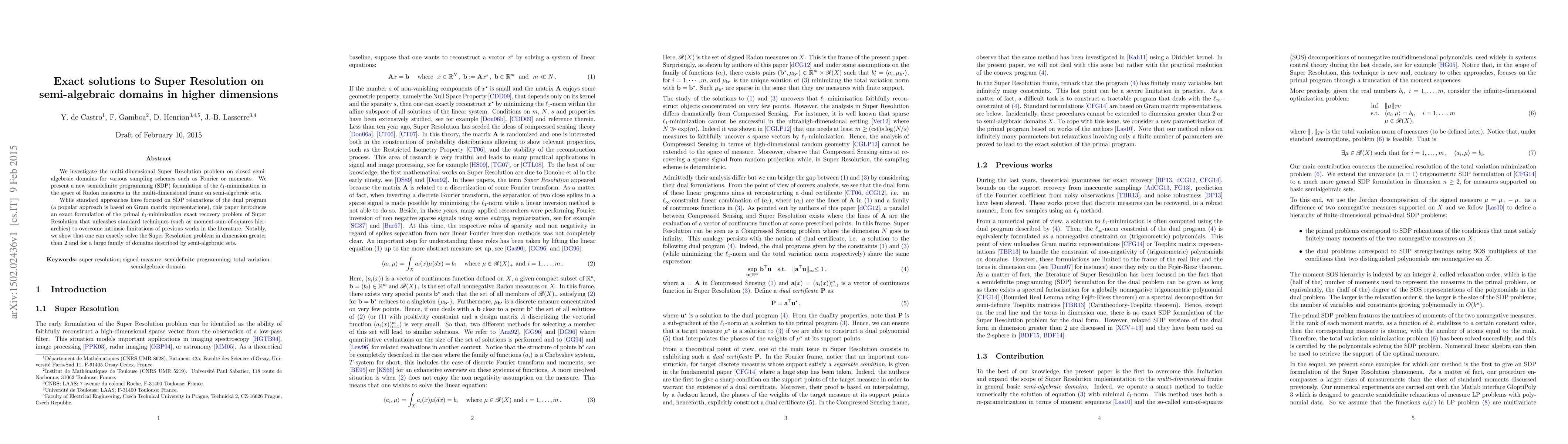 We investigate the multi-dimensional Super Resolution problem on closed semi-algebraic domains for various sampling schemes such as Fourier or moments. We present a new semidefinite programming (SDP) formulation of the 1 -minimization in the space of Radon measures in the multi-dimensional frame on semi-algebraic sets. While standard approaches have focused on SDP relaxations of the dual program (a popular approach is based on Gram matrix representations), this paper introduces an exact formulation of the primal 1 -minimization exact recovery problem of Super Resolution that unleashes standard techniques (such as moment-sum-of-squares hier-archies) to overcome intrinsic limitations of previous works in the literature. Notably, we show that one can exactly solve the Super Resolution problem in dimension greater than 2 and for a large family of domains described by semi-algebraic sets.